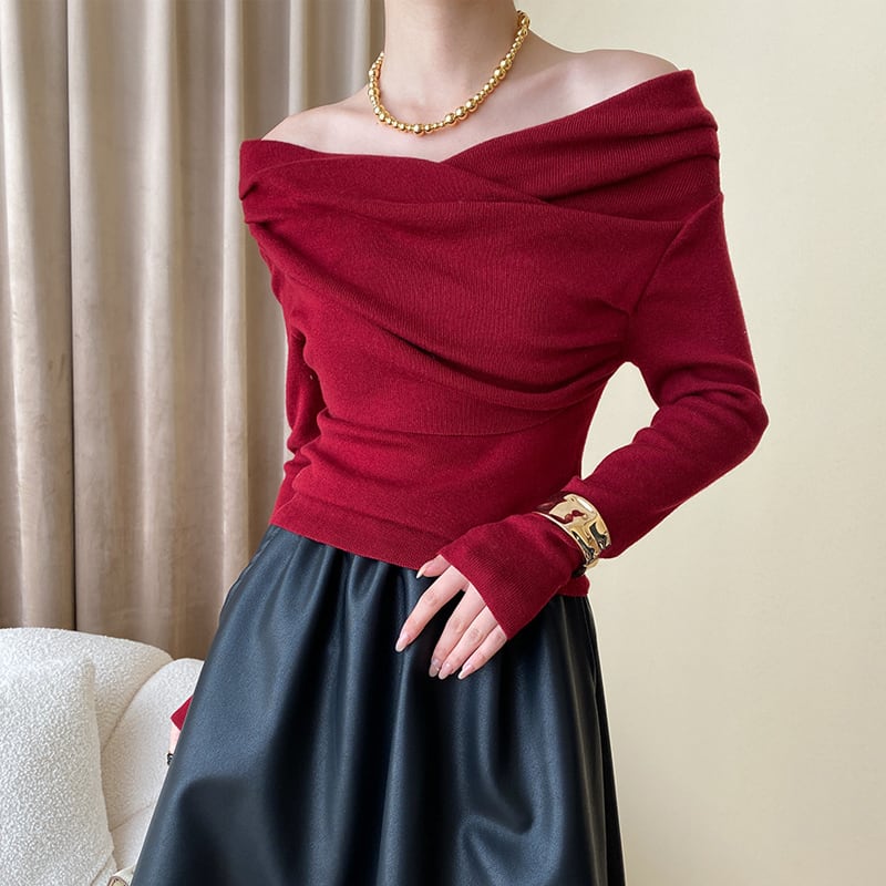 トップス ニット 4色展開 ボートネックデザイン 長袖 ベージュ ブラック ワインレッド ブラウン