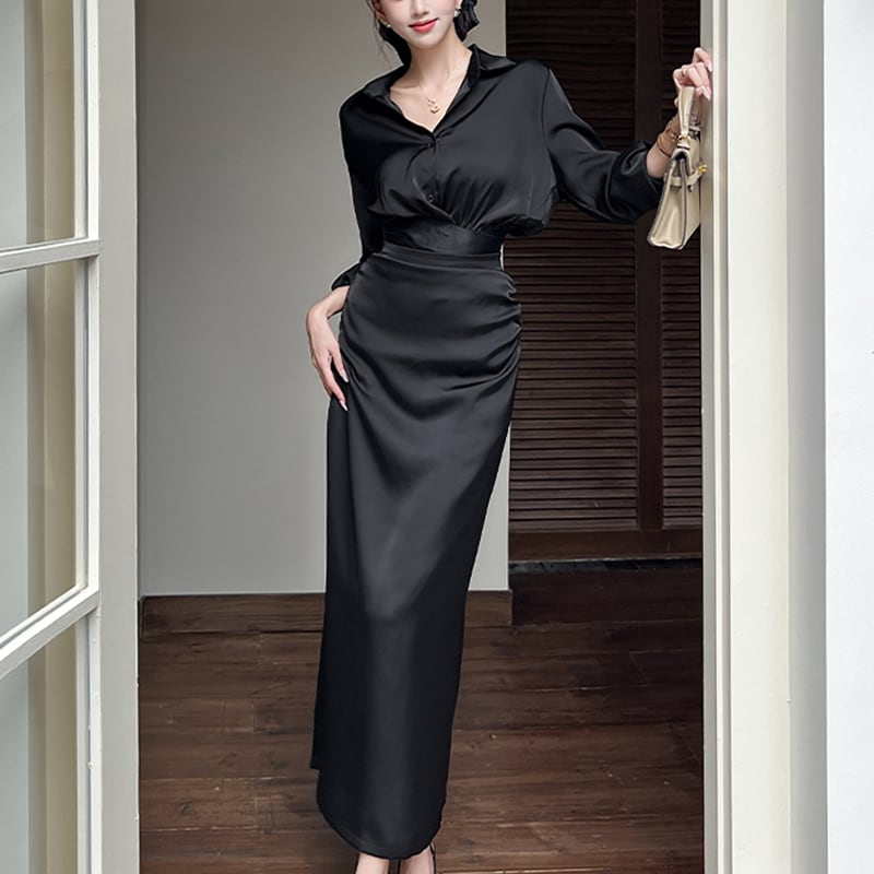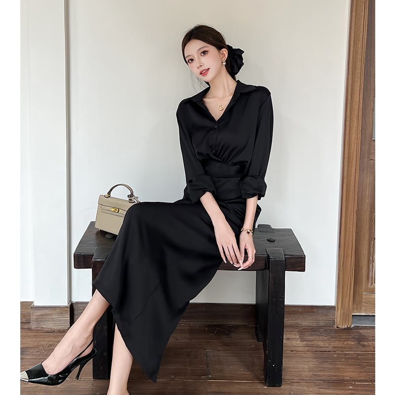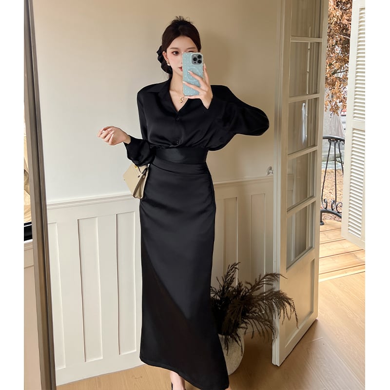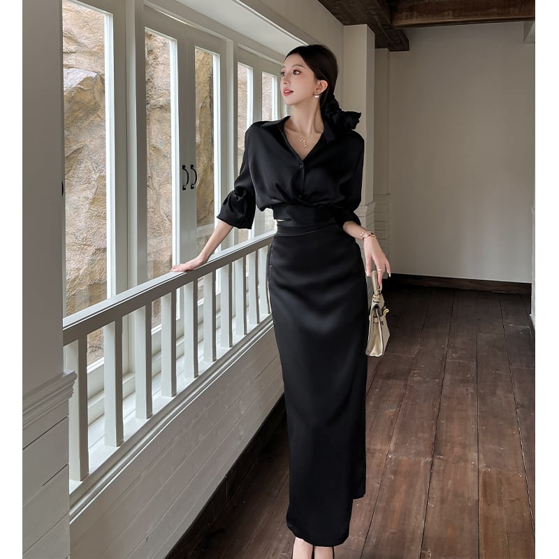 【CHERRYシリーズ】セットアップ シャツ+スカート 無地 フェミニン ブラック S M L