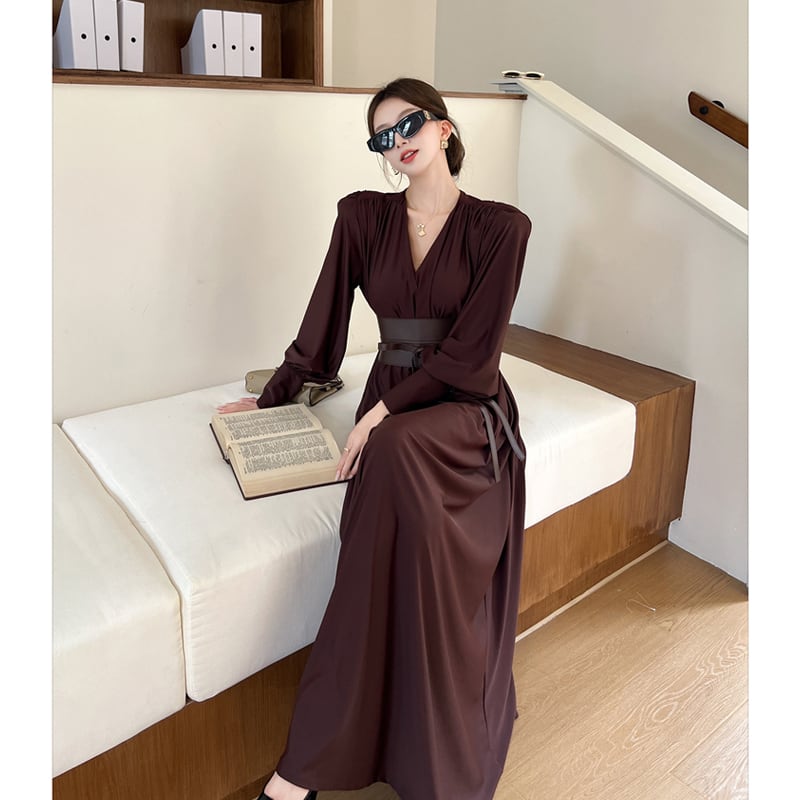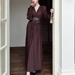 【CHERRYシリーズ】ロングワンピース Vネック フェミニン コーヒー色 ブラック S M L