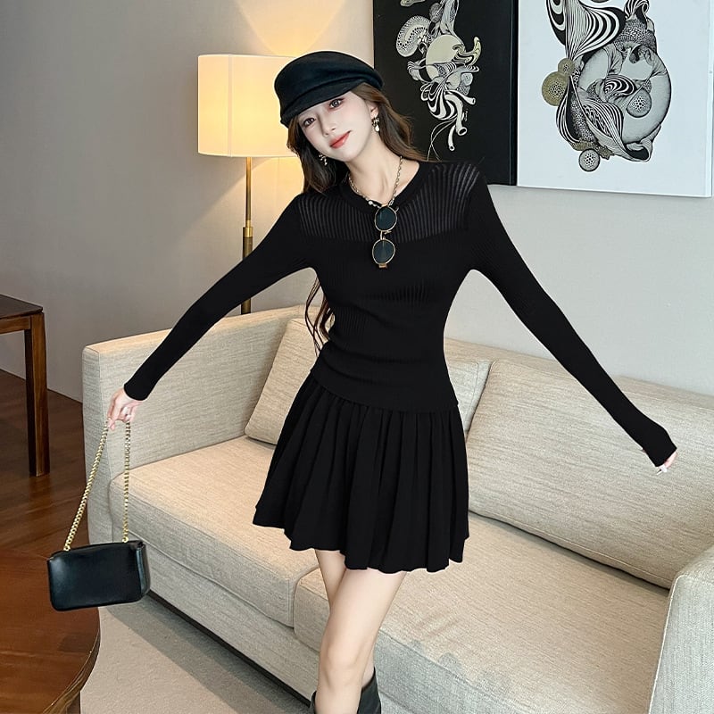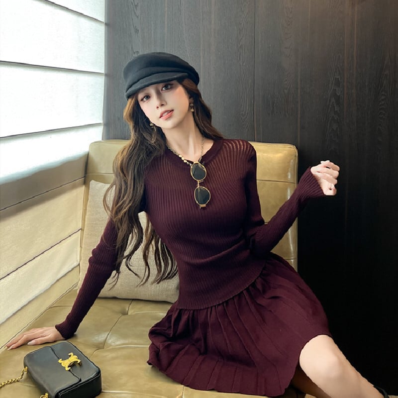 【CHERRYシリーズ】セットアップ トップス+スカート 無地 ニット ワインレッド グレー ブラック