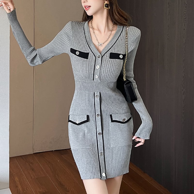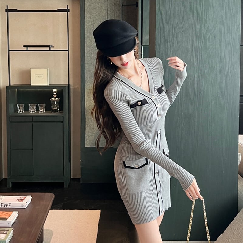 【CHERRYシリーズ】ワンピース Vネック 長袖 シンプル シンプル グレー