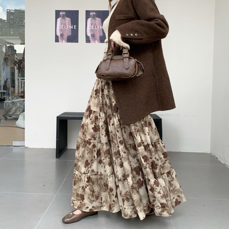 ボトムス スカート ロング丈 花柄 ウエストゴム レトロ コーヒー色