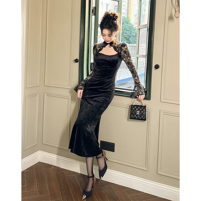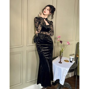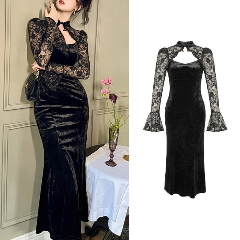 ハロウィン風ドレス ベルベット パーティー レース スピーカースリーブ ブラック S M L