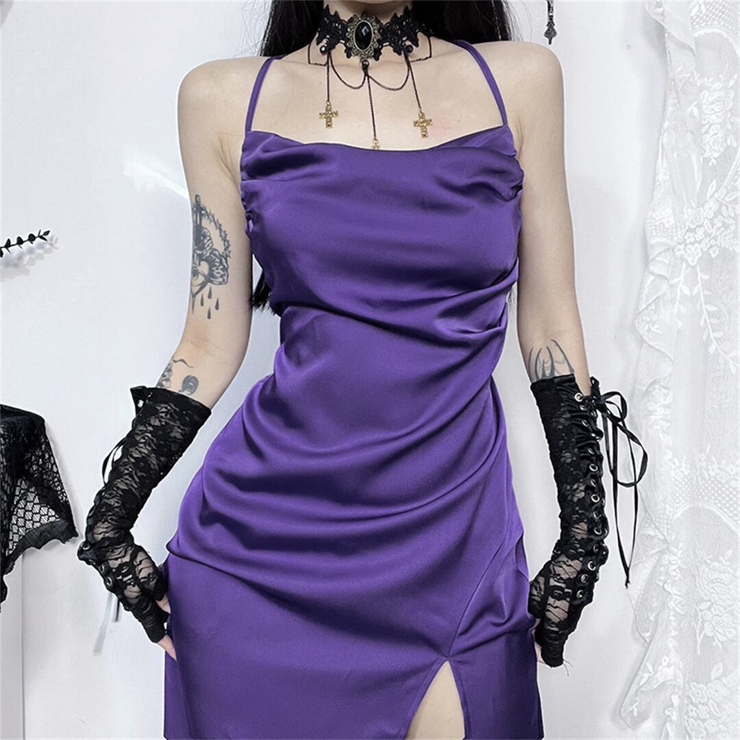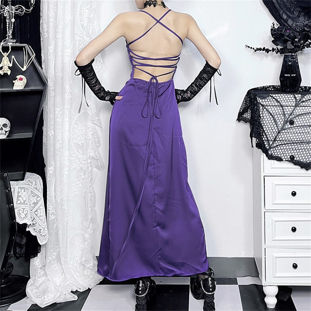 ワンピース セクシー 無地 スリット バックレス パープル XS S M L