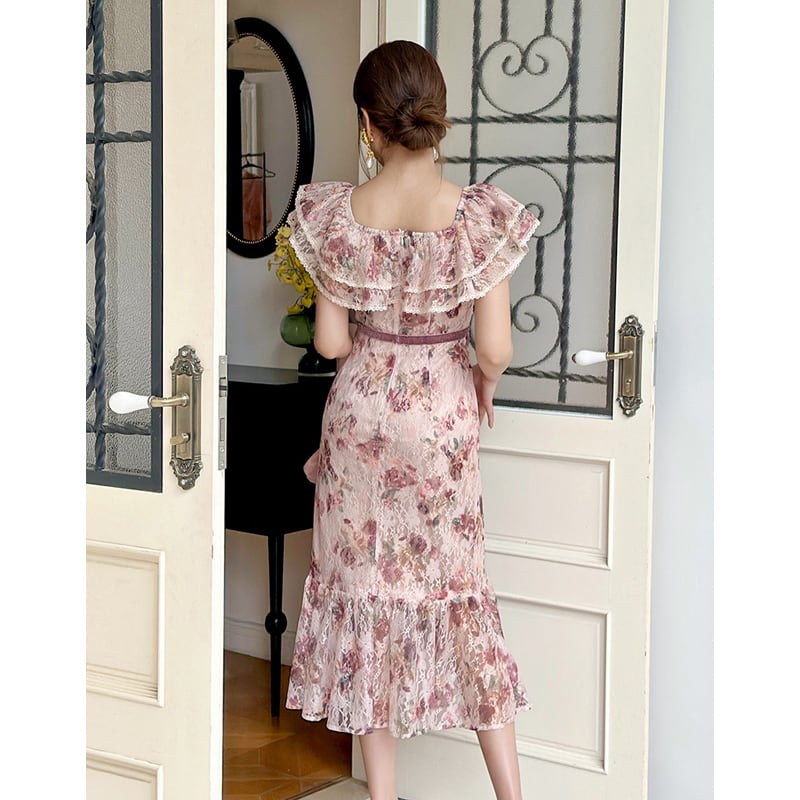 【夕暮薔薇シリーズ】ワンピース ボートネックデザイン レース 花柄 綺麗め S M L XL