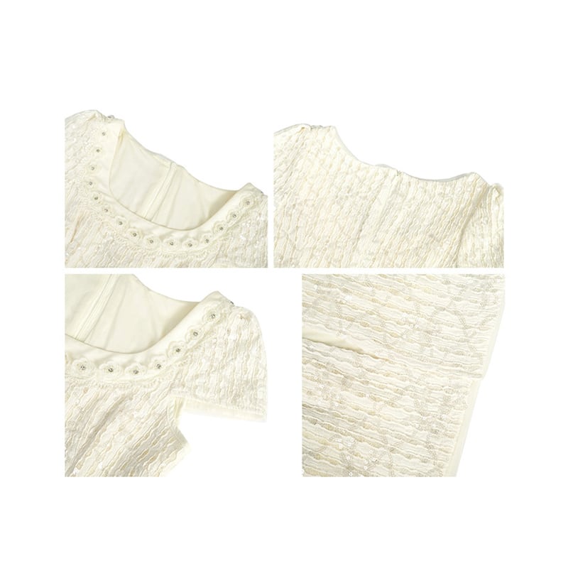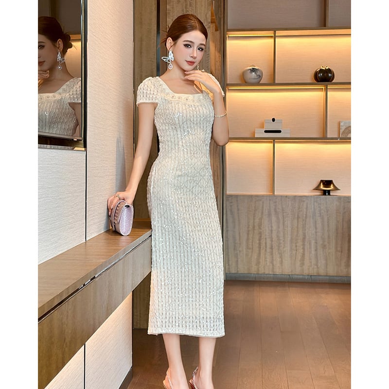 【夕暮薔薇シリーズ】ワンピース スクエアネック スリミング スパンコール ベージュ M L XL