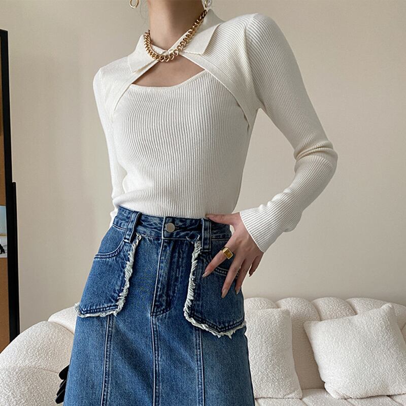 トップス ニット 3色展開 長袖 ピークドラペル ブラック ホワイト ダークベージュ