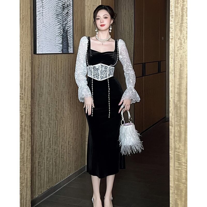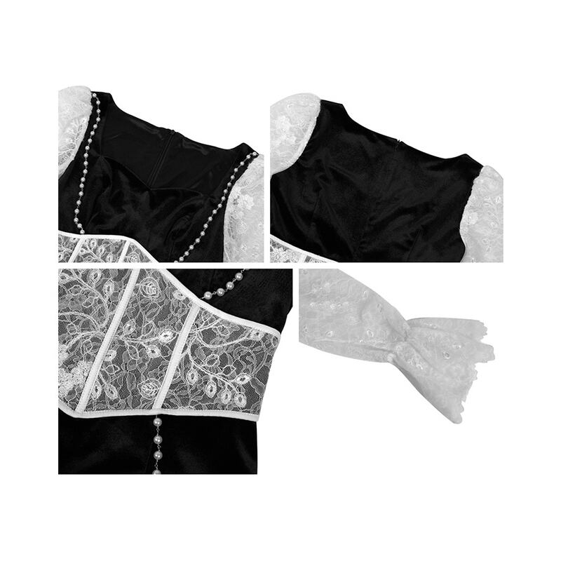 ハロウィン風ドレス ビロード スクエアネック レース ブラック S M L XL