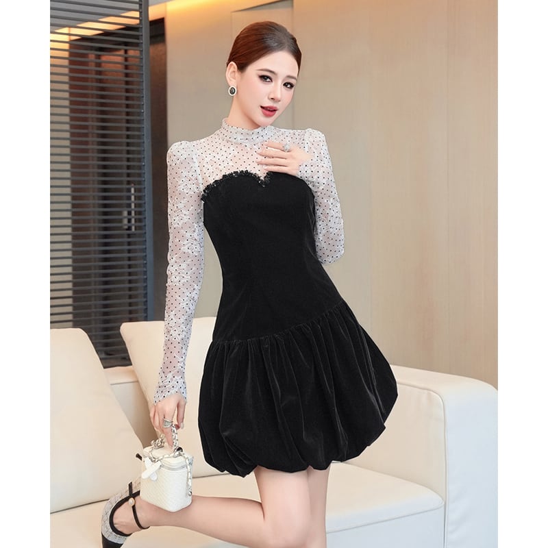 【夕暮薔薇シリーズ】ワンピース ビロード ドット柄 ティアード ブラック S M L XL