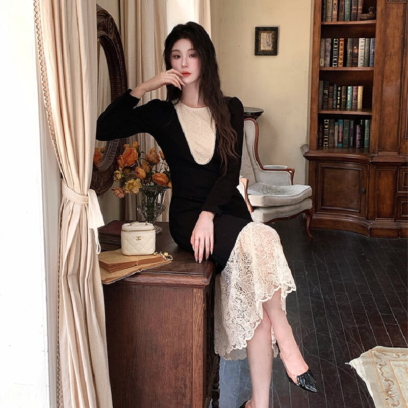 ワンピース レース 配色 長袖 ラウンドネック 気質溢れる S M L XL