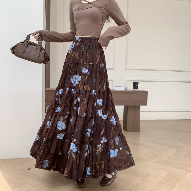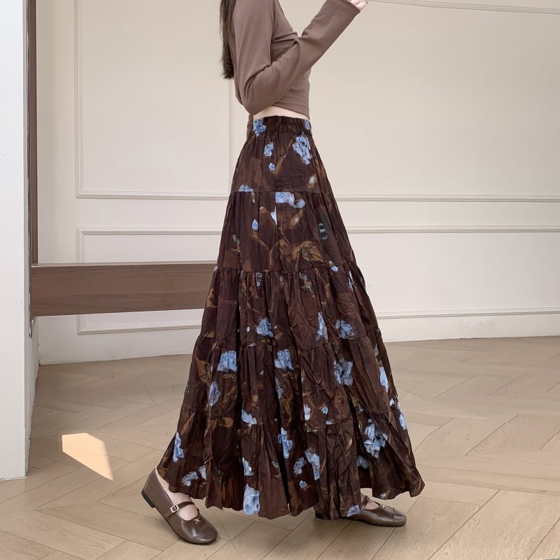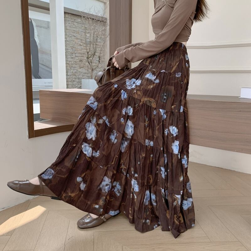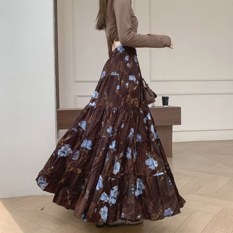 ボトムス スカート 花柄 ロング丈 合わせやすい フレア カジュアル コーヒー色