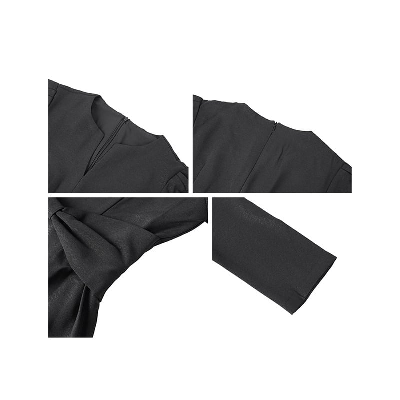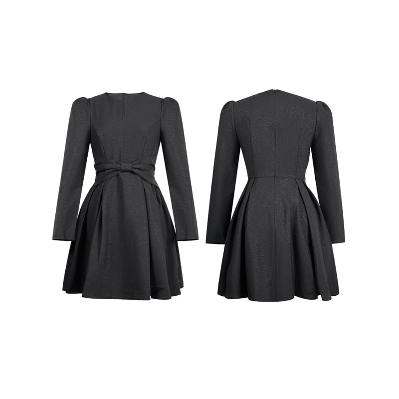 【夕暮薔薇シリーズ】ワンピース ウエスト絞り Aライン 長袖 ブラック S M L XL