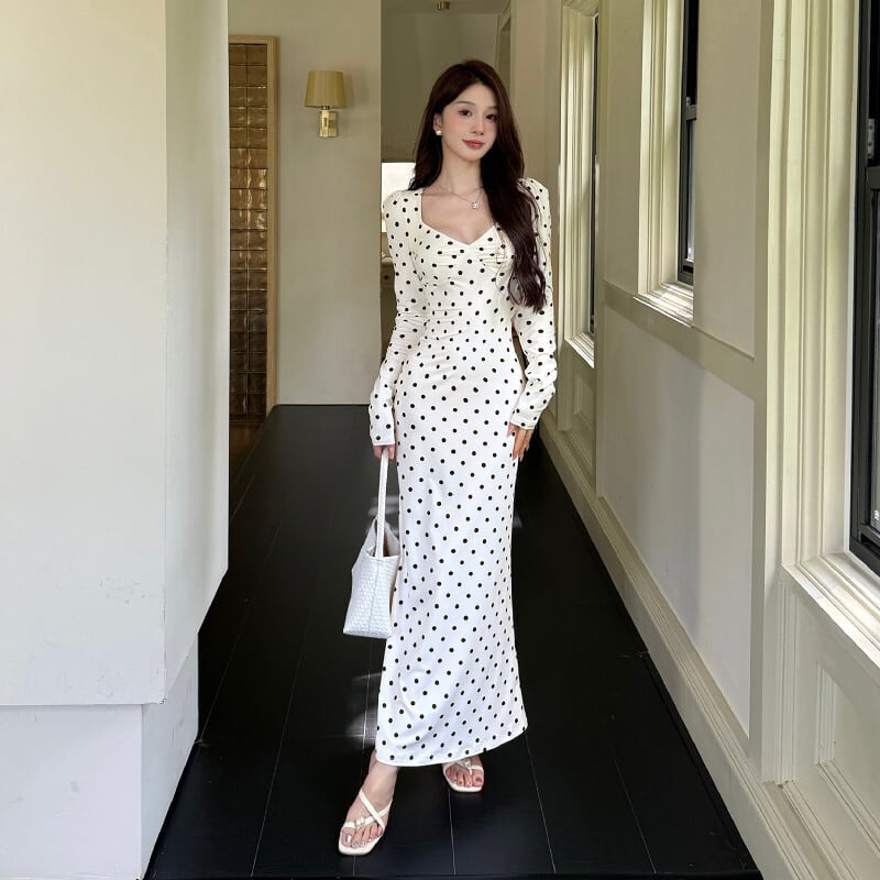 ワンピース 水玉 長袖 ロング丈 気質溢れる ドット柄 S M L XL
