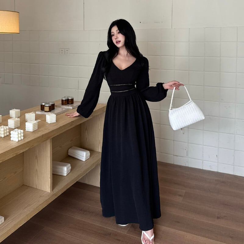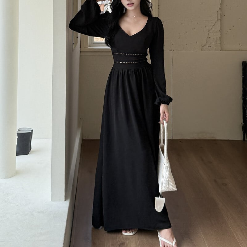 ワンピース ランタンスリーブ ロング丈 長袖 ブラック S M L XL