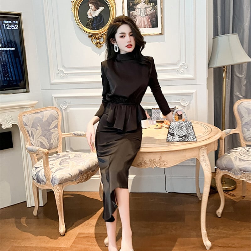 【夕暮薔薇シリーズ】セットアップ トップス+スカート フェミニン 不規則 長袖 ブラック S M L