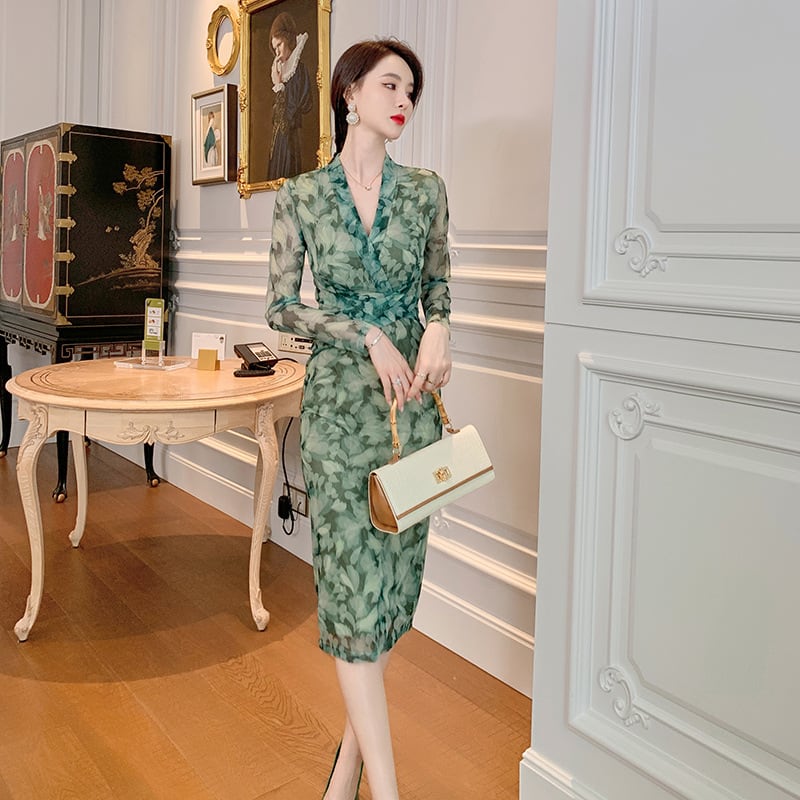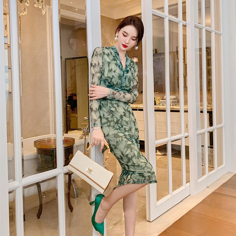 【夕暮薔薇シリーズ】ワンピース Vネック 長袖 プリント グリーン S M L XL
