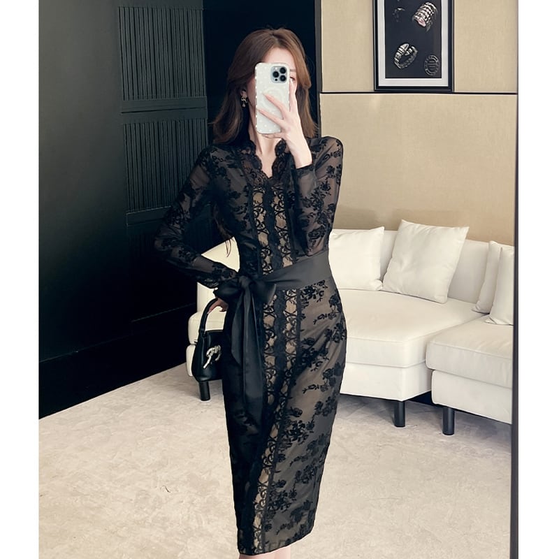 【CHERRYシリーズ】ワンピース Vネック レース 魅せられる ブラック S M L XL