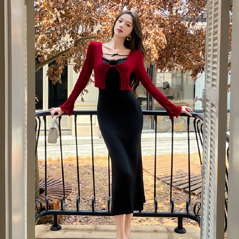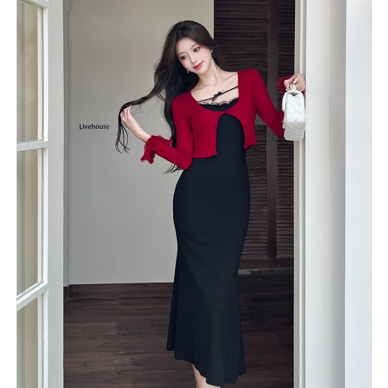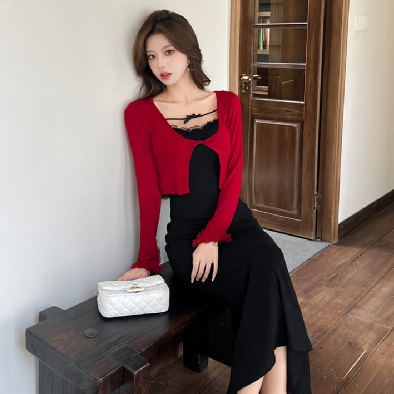 【CHERRYシリーズ】セットアップ カーディガン+ワンピース ファッション 視線集中 レッド+ブラック