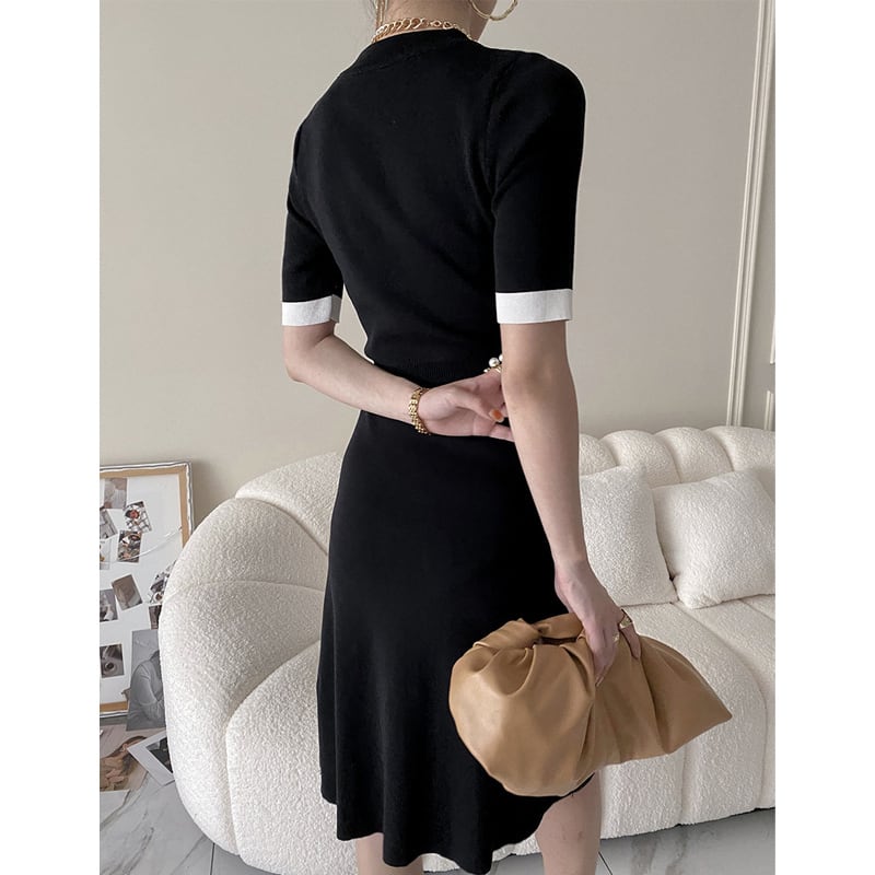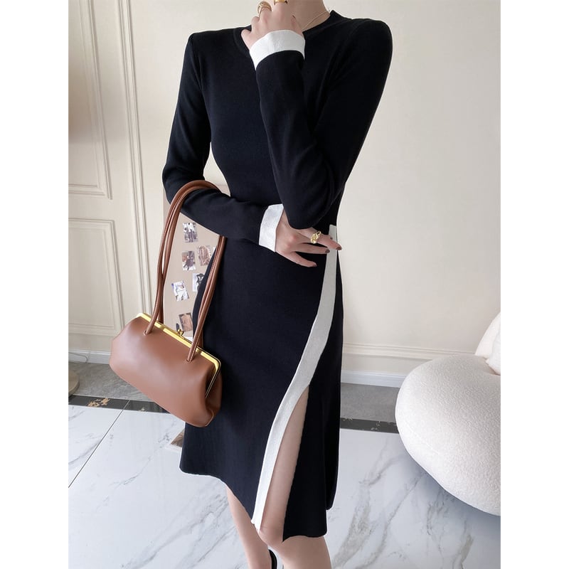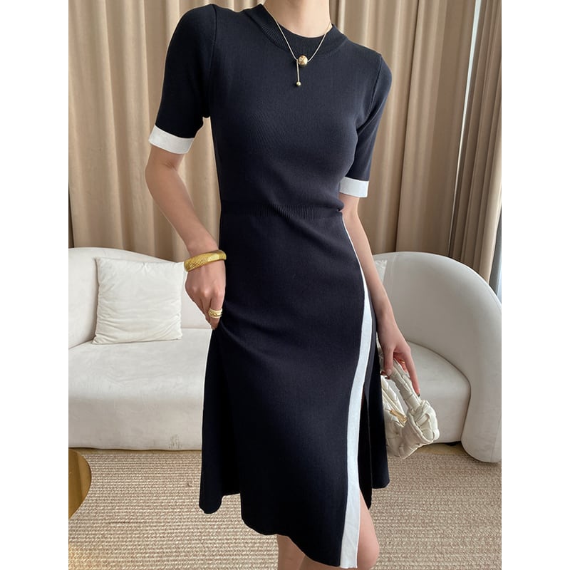 ワンピース 袖丈2タイプ ニット スリット 配色 ブラック M L