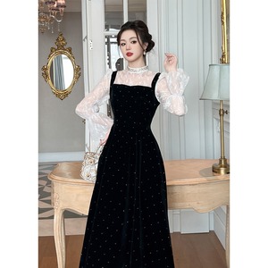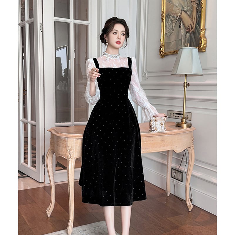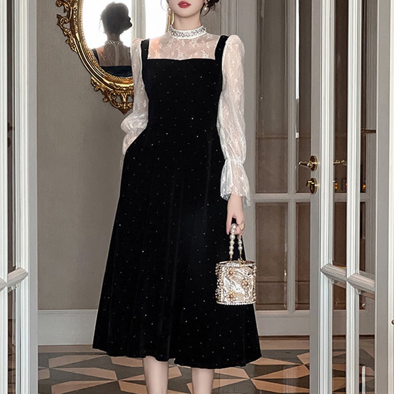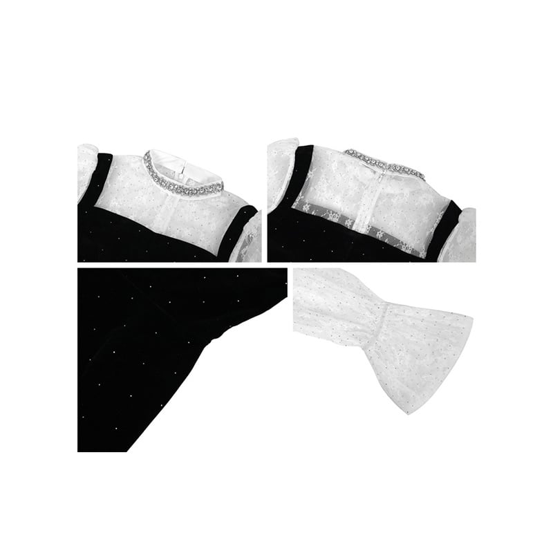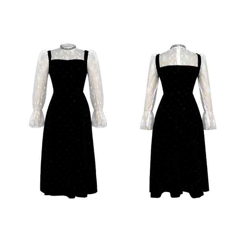 【夕暮薔薇シリーズ】ワンピース ビロード 長袖 レトロ ホワイト+ブラック S M L XL
