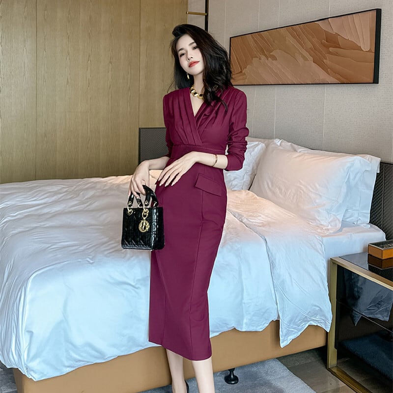 【夕暮薔薇シリーズ】ワンピース Vネック フェミニン 気質満点 無地 S M L XL