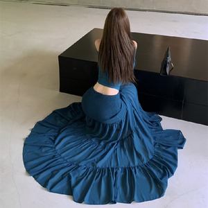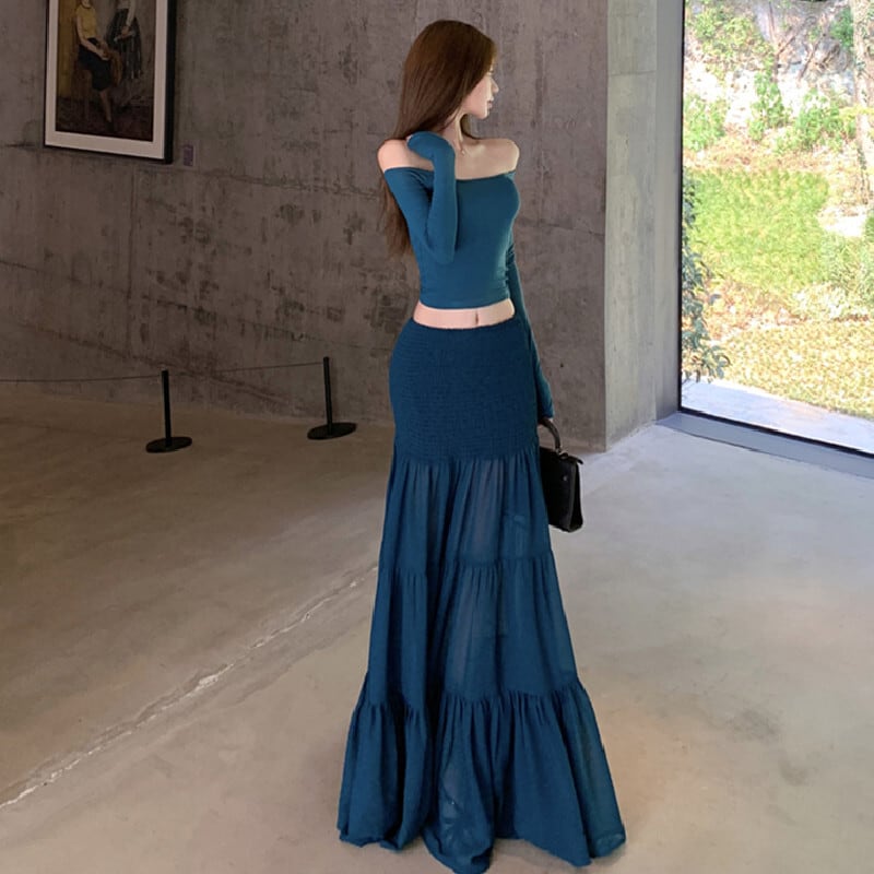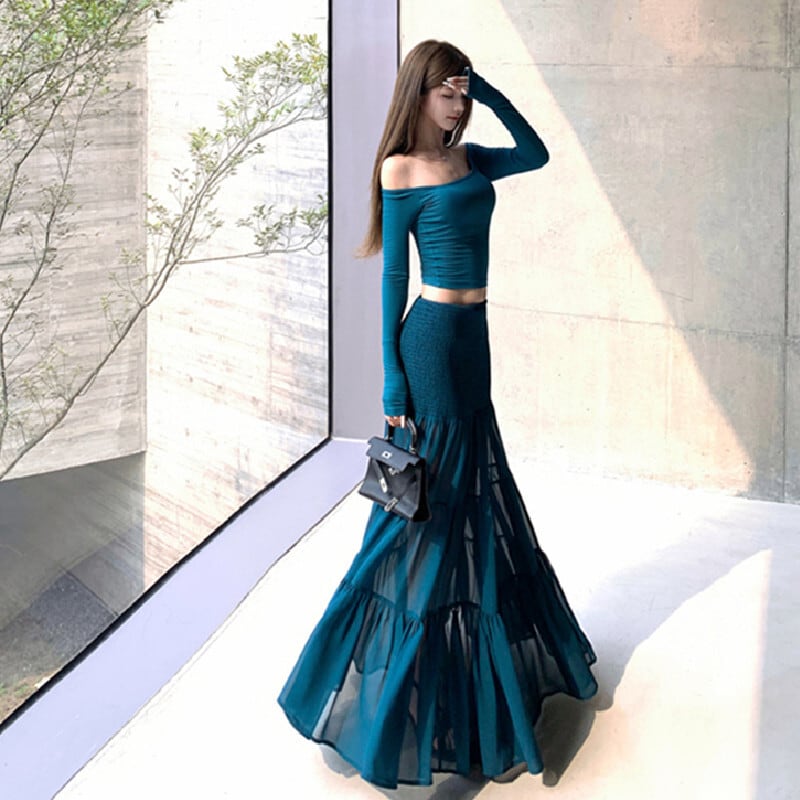 セットアップ トップス+スカート ボートネックデザイン 無地 ブルー S M L