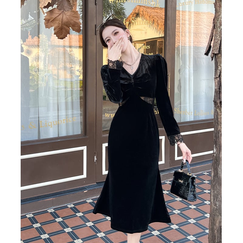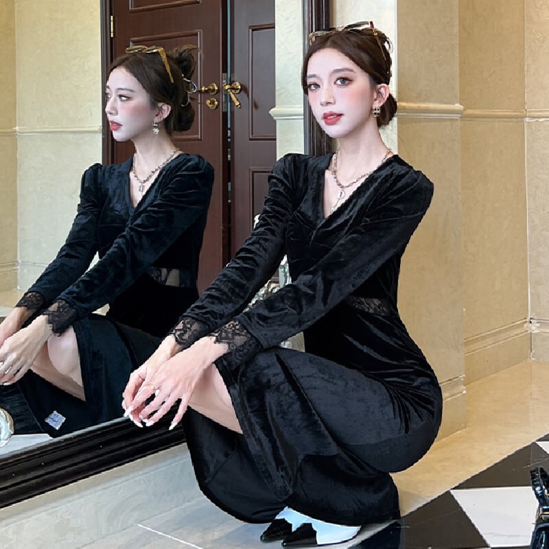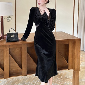 【CHERRYシリーズ】ワンピース ビロード Vネック フェミニン ブラック S M L XL