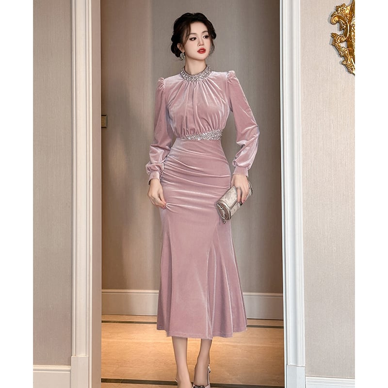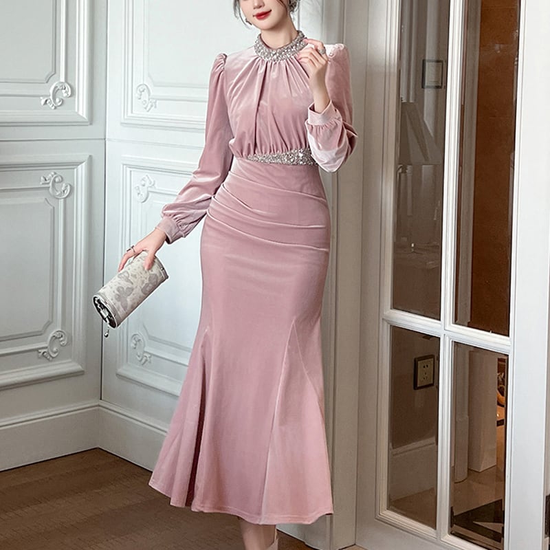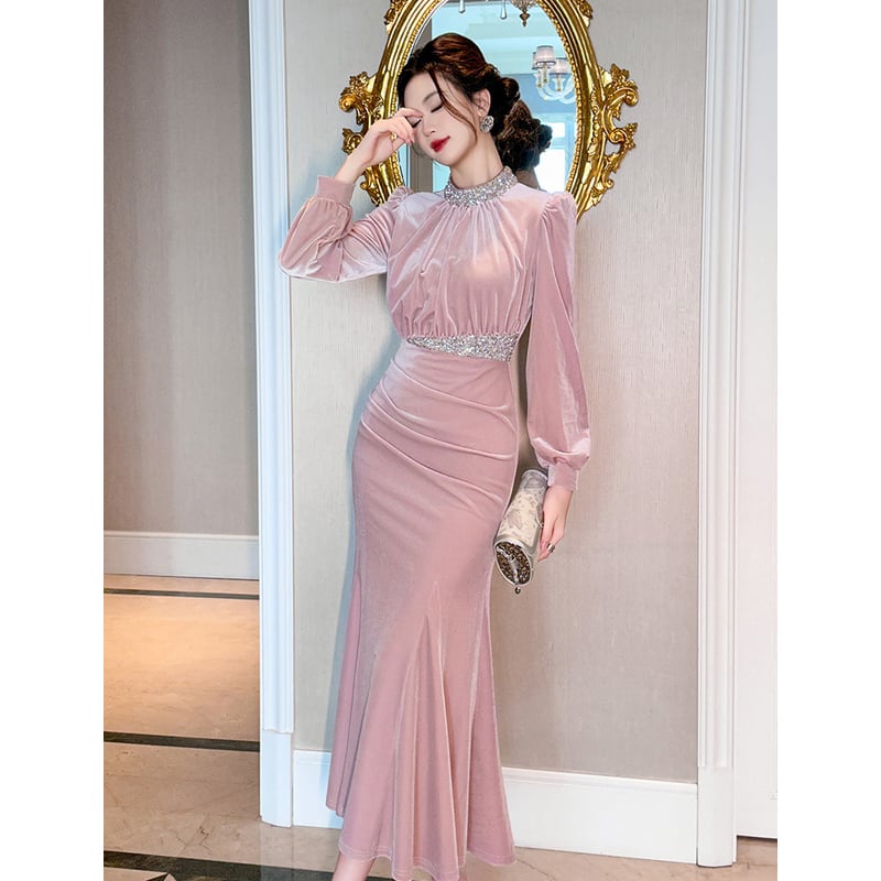 【夕暮薔薇シリーズ】ワンピース ビロード フィッシュテール スパンコール ピンク S M L XL