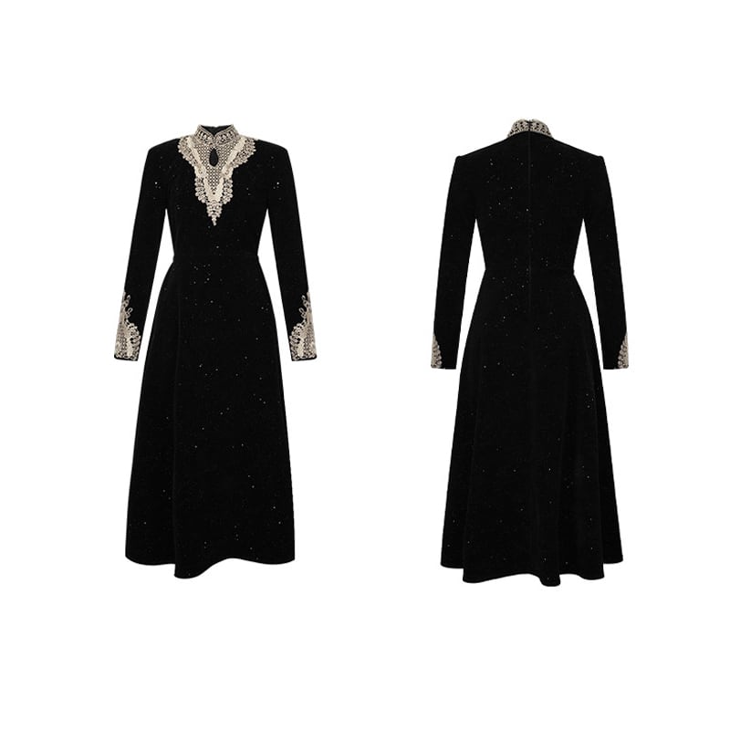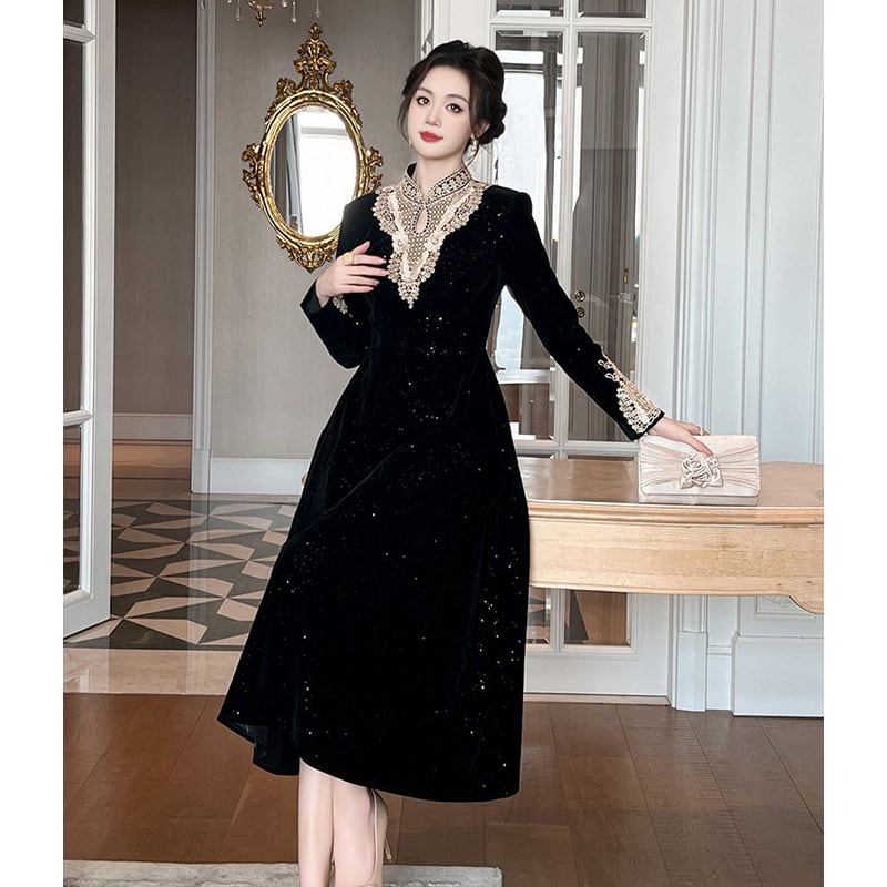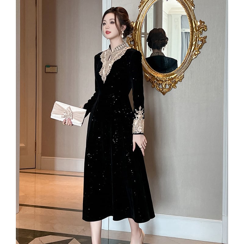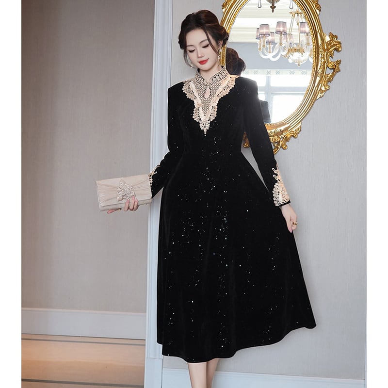 【夕暮薔薇シリーズ】ワンピース 刺繡 ビロード 気質溢れる ブラック S M L XL