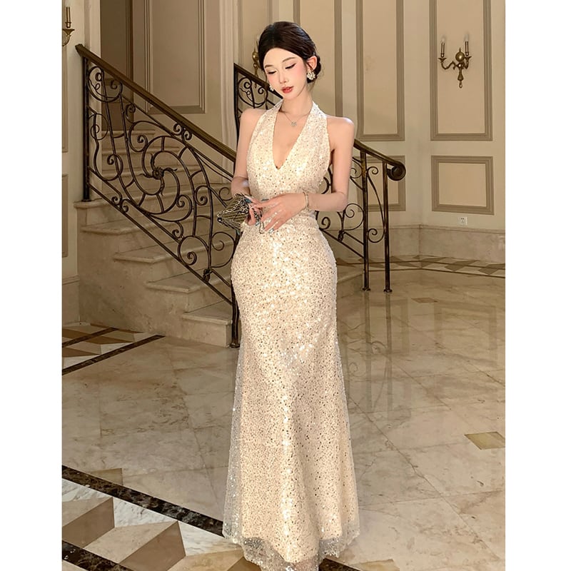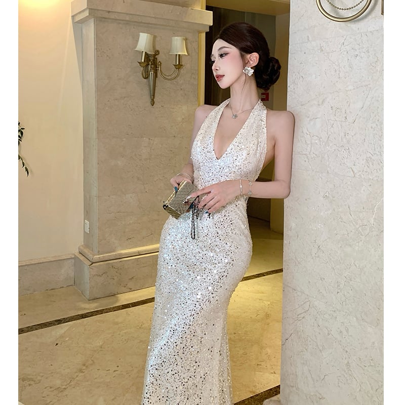 ワンピース Vネック バックレス スパンコール パーティー S M L