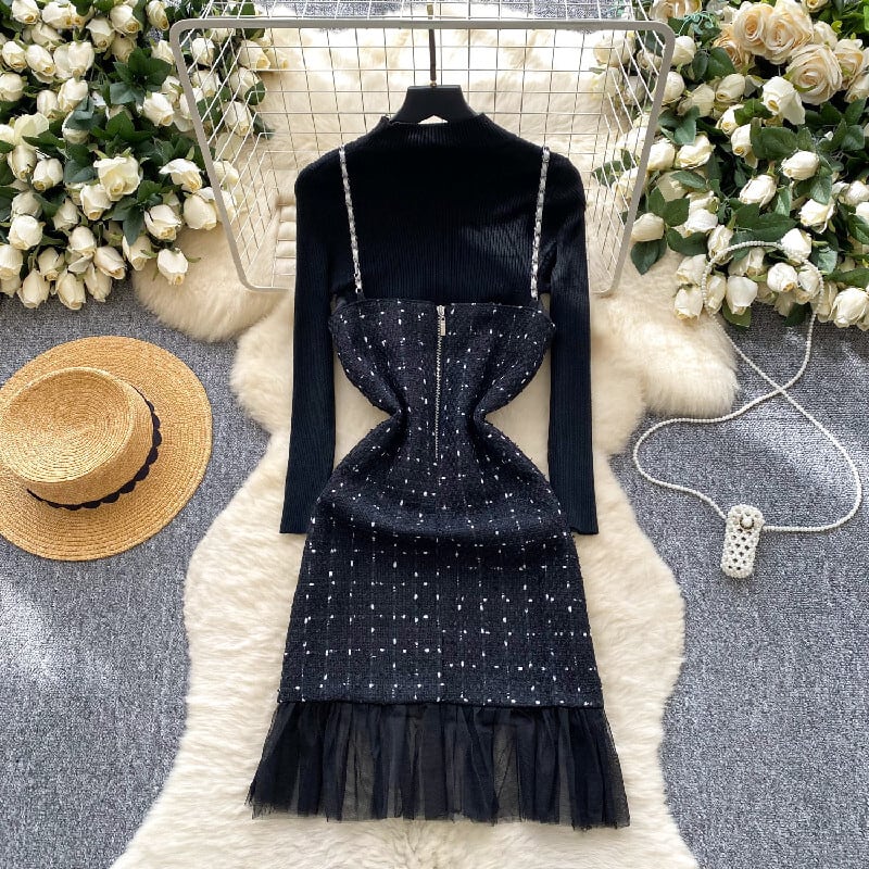 セットアップ トップス+ベストワンピース チェック柄 メッシュ ブラック S M L XL
