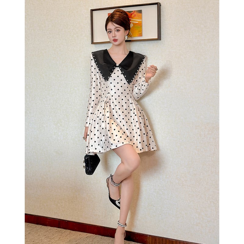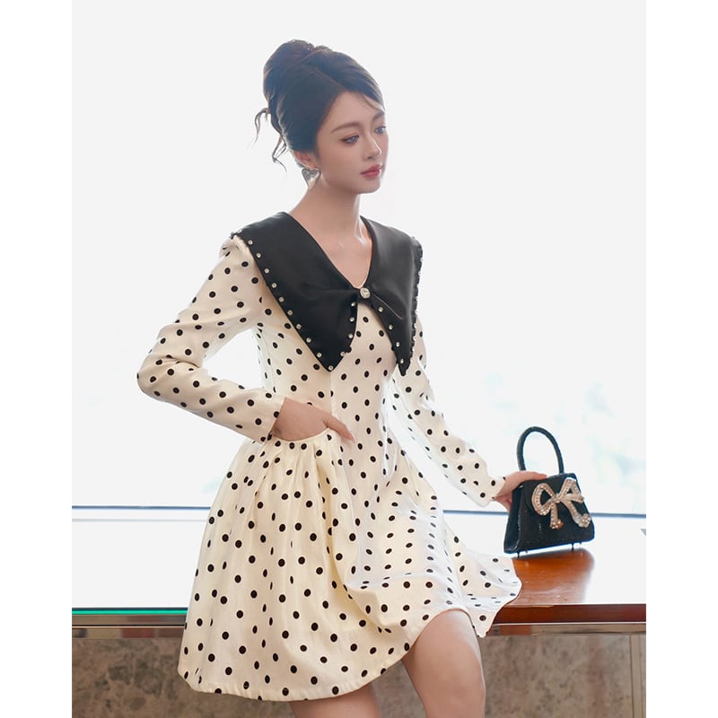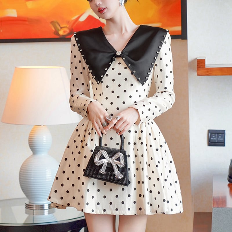 【夕暮薔薇シリーズ】ワンピース ドット柄 長袖 ラウンドカラー ラインストーン S M L XL