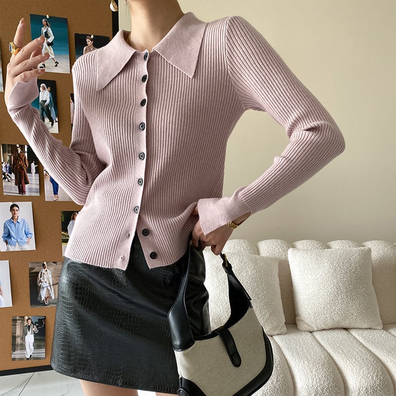 6colors トップス ニット 長袖 POLOネック シングルブレスト ベージュ ブラック パープル ブルー イエロー ピンク