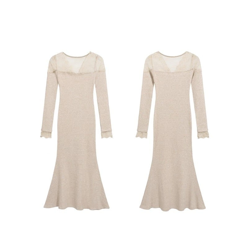 ✿2025秋新作✿ワンピース Vネック レース フィッシュテール ダークベージュ S M L