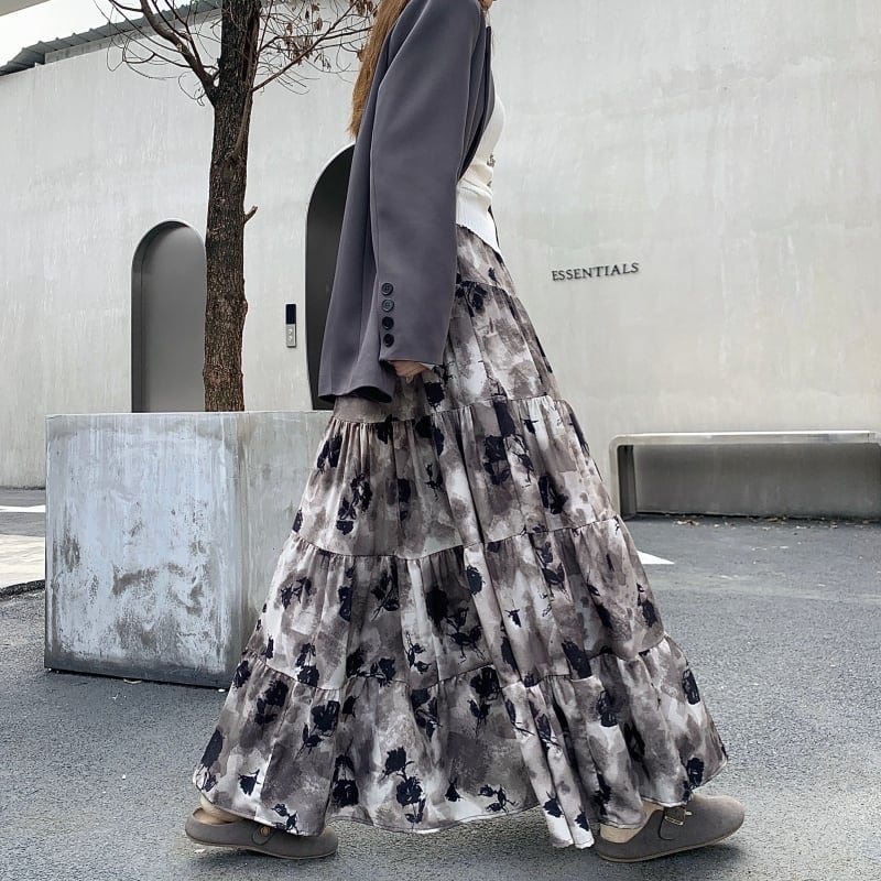 ボトムス スカート 花柄 ロング丈 レトロ カジュアル グレー