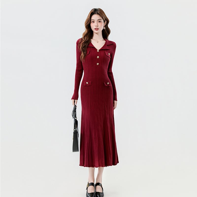 ワンピース 3色展開 ニット シンプル 長袖 レッド ブラック ベージュ S M L