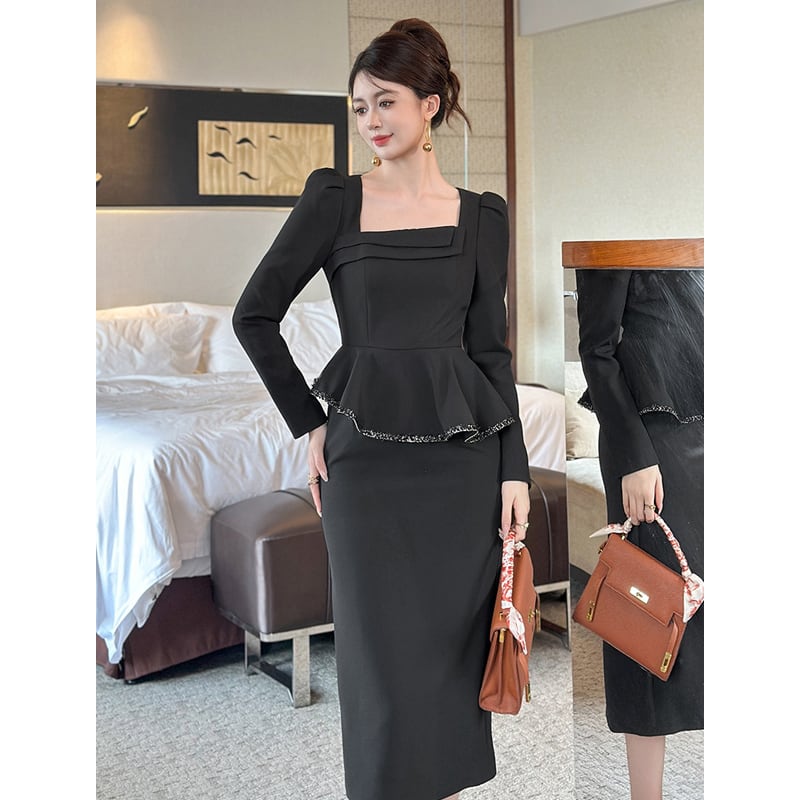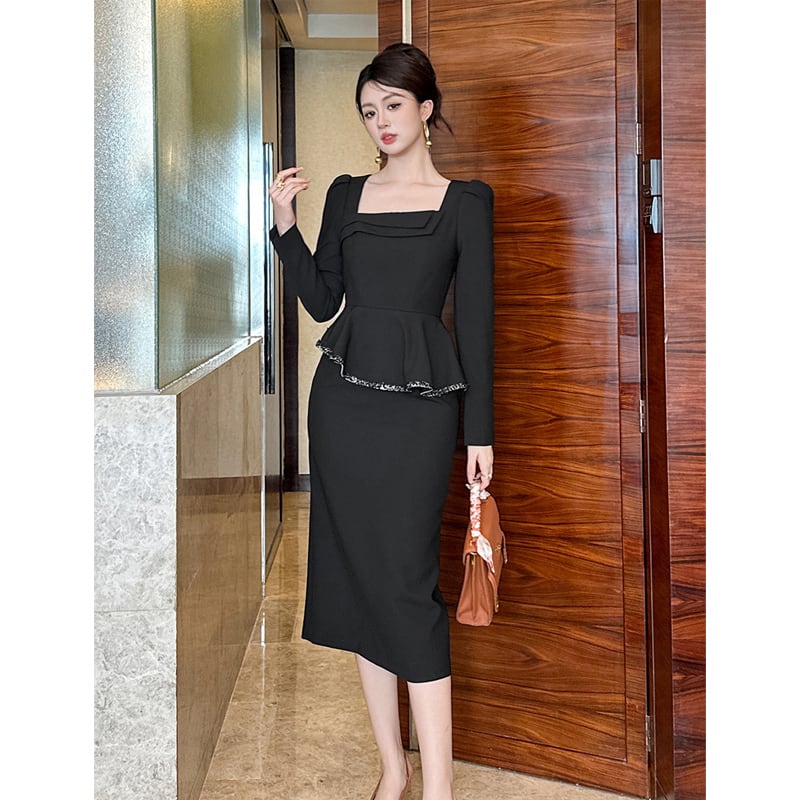 【夕暮薔薇シリーズ】ワンピース スクエアネック ペプラム ブラック S M L XL