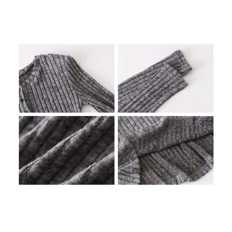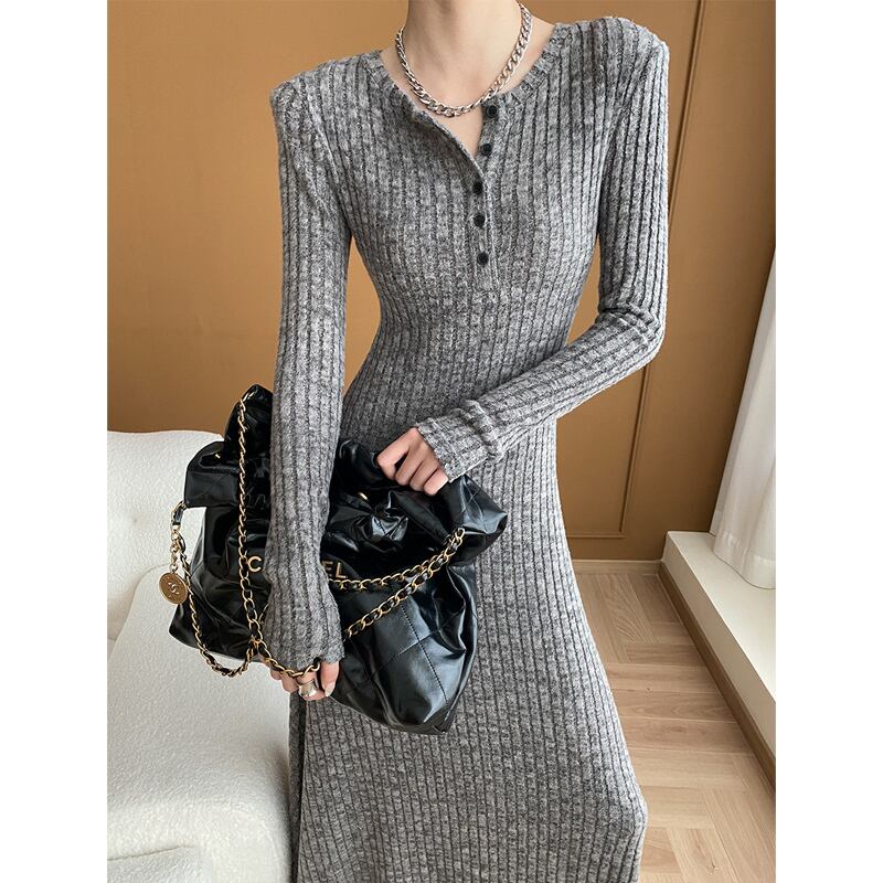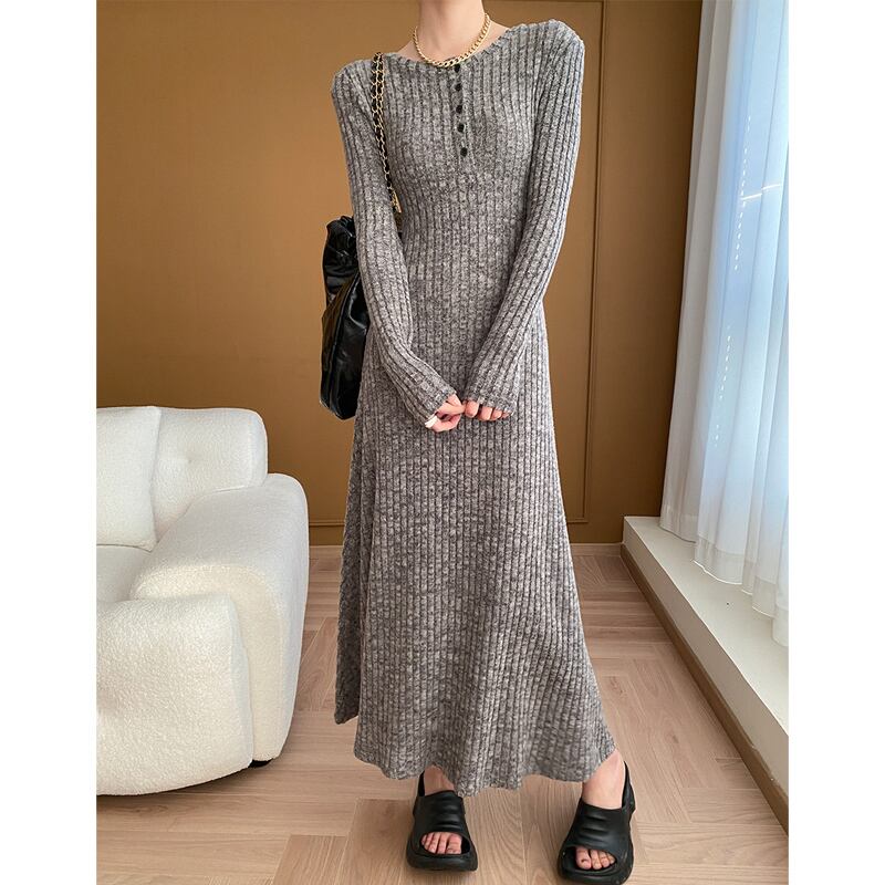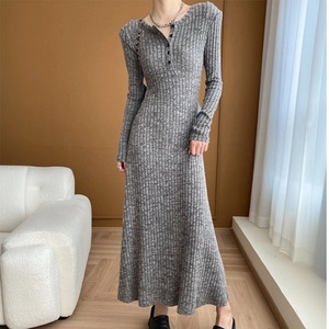 ワンピース シンプル ニット ラウンドネック フィット グレー S M L