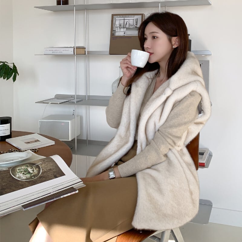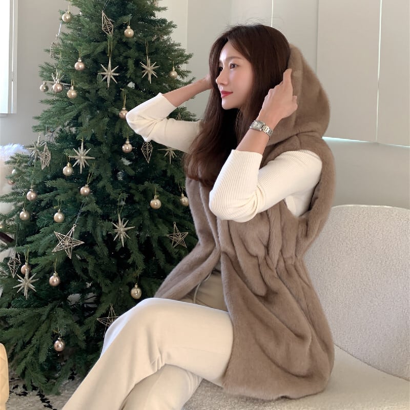 ベスト 2色展開 ミンク風 フィット感 フード付き ブラウン ベージュ