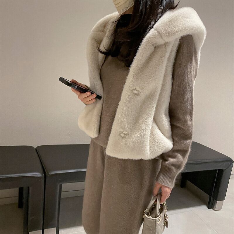 ベスト 2色展開 ミンク風 ゆるい フード付き グレー ベージュ