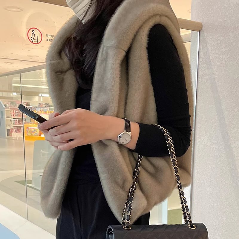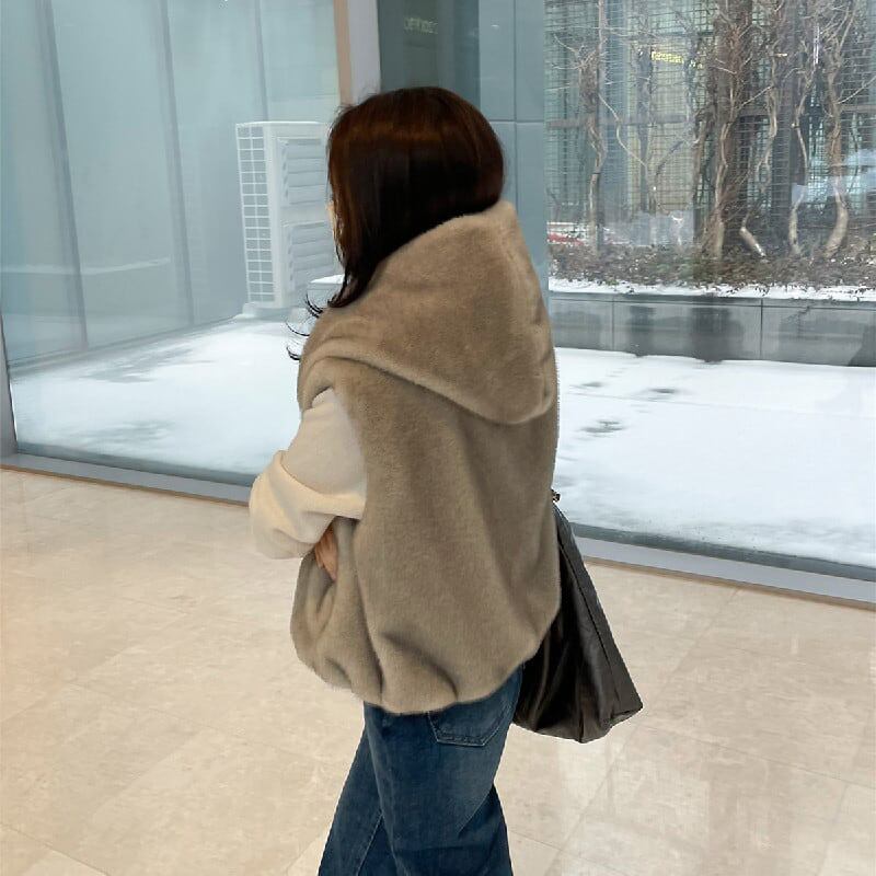 ベスト 2色展開 ミンク風 ゆるい フード付き ブラウン ベージュ