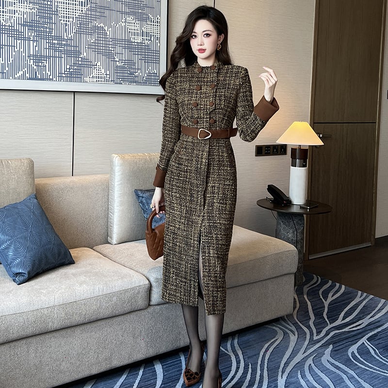 【夕暮薔薇シリーズ】ワンピース ダブルブレスト 気質満点 スリット ブラウン S M L XL