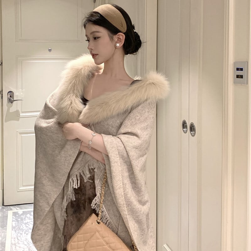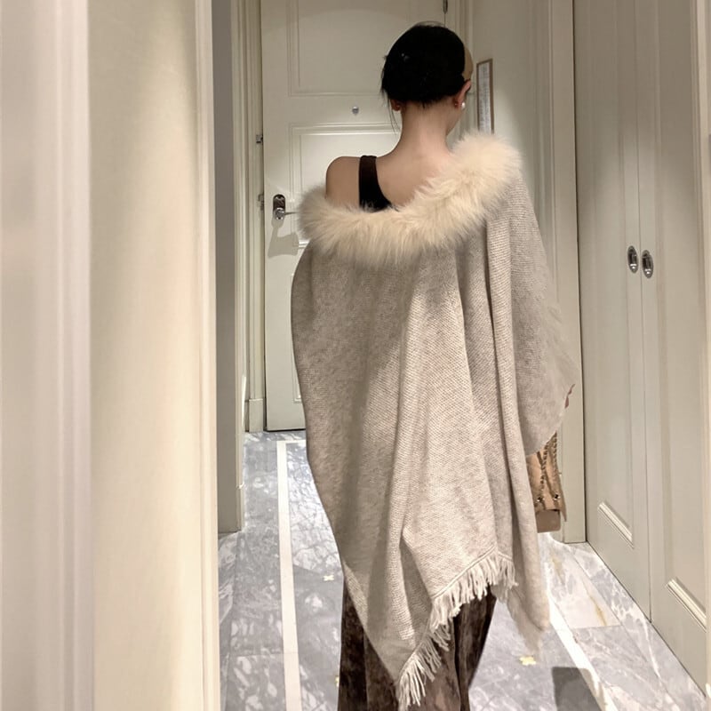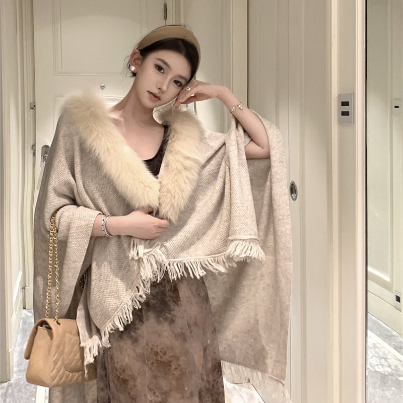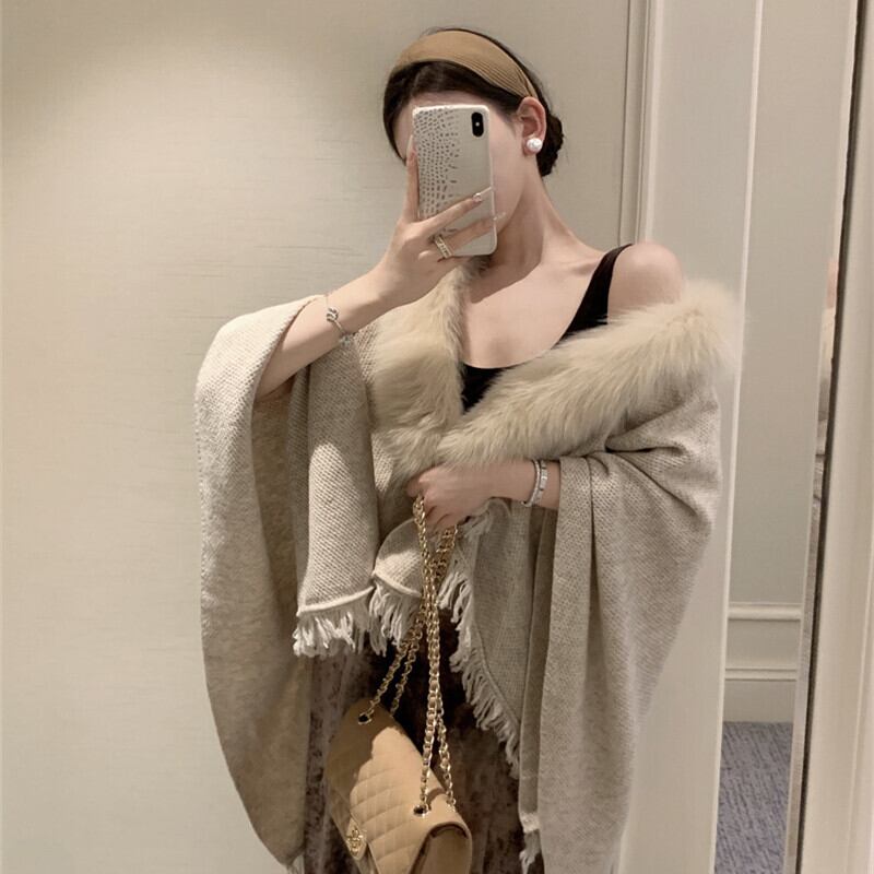 アウター ケープ フリンジ ファー 高級感 ダークベージュ