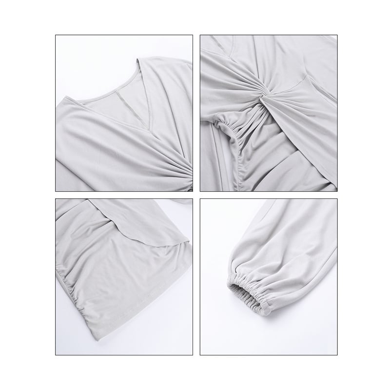 ワンピース Vネック ランタンスリーブ 膝上 ライトグレー S M L
