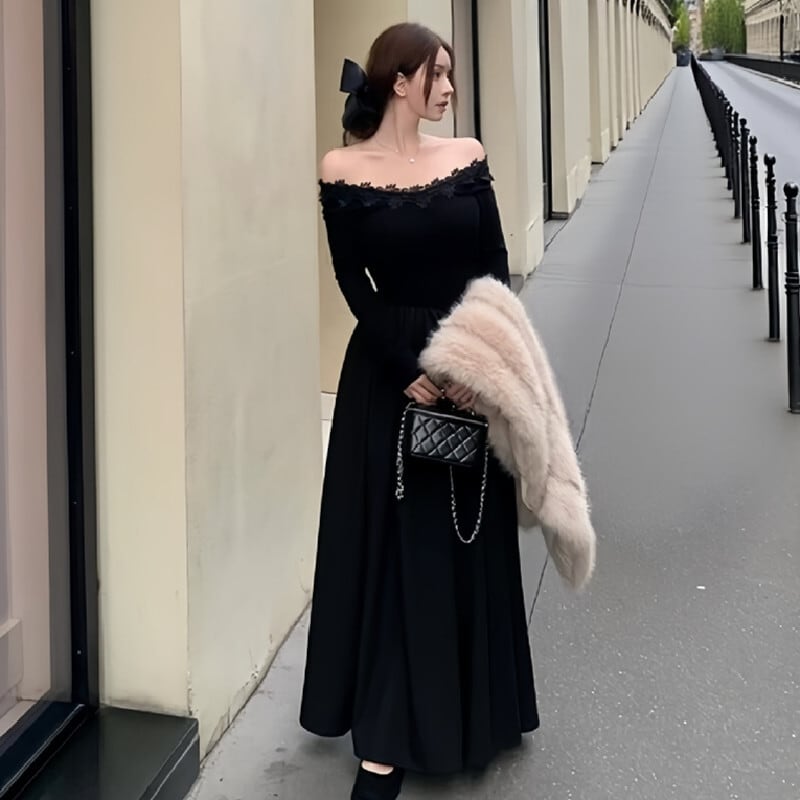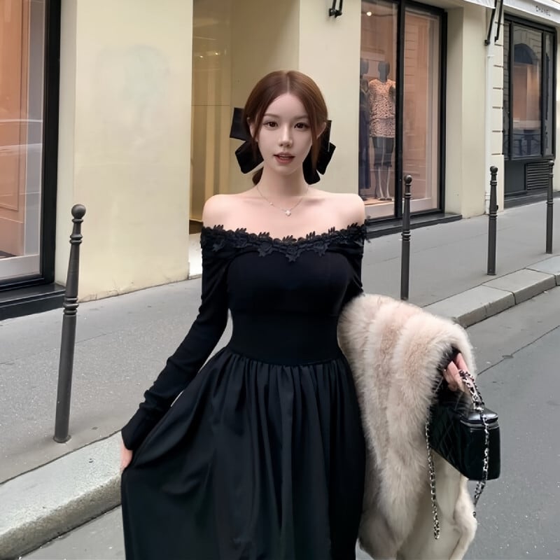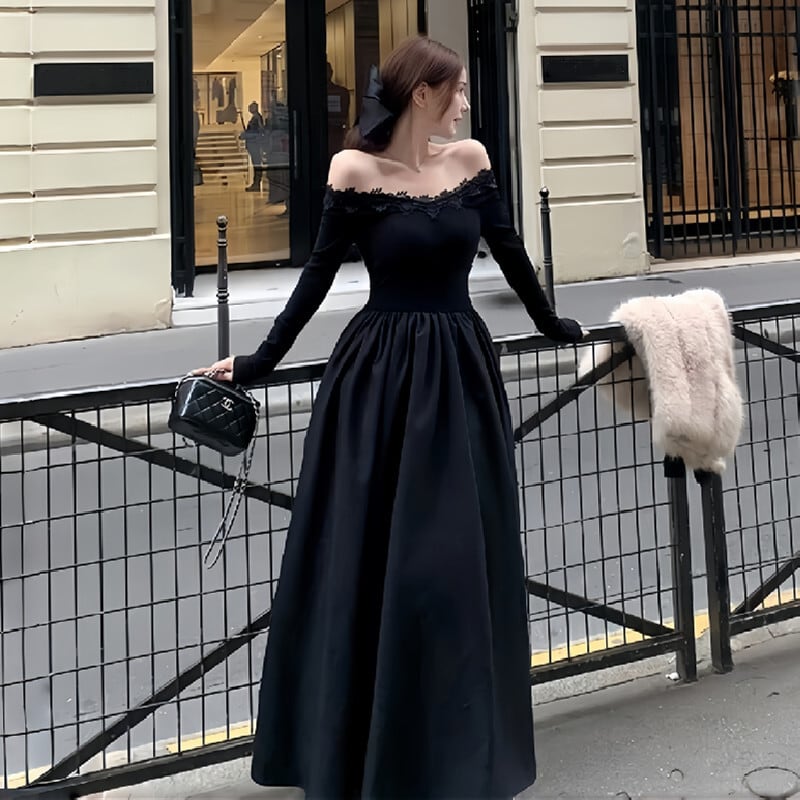 ワンピース ボートネックデザイン レトロ 大振裾 ブラック S M L