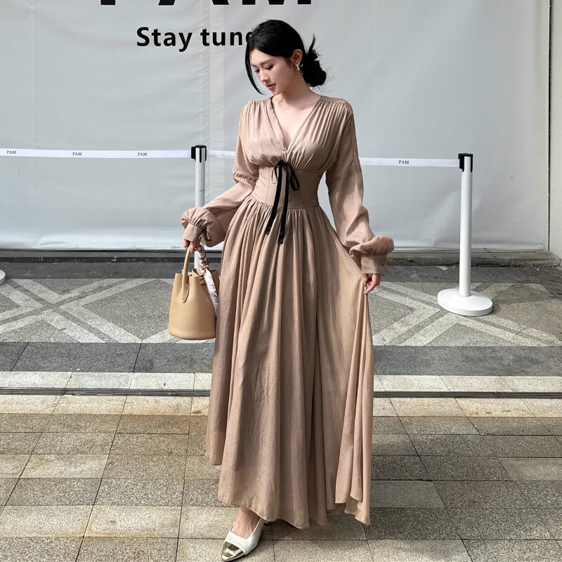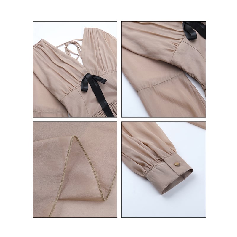ワンピース Vネック バックリボン ランタンスリーブ ライトブラウン S M L