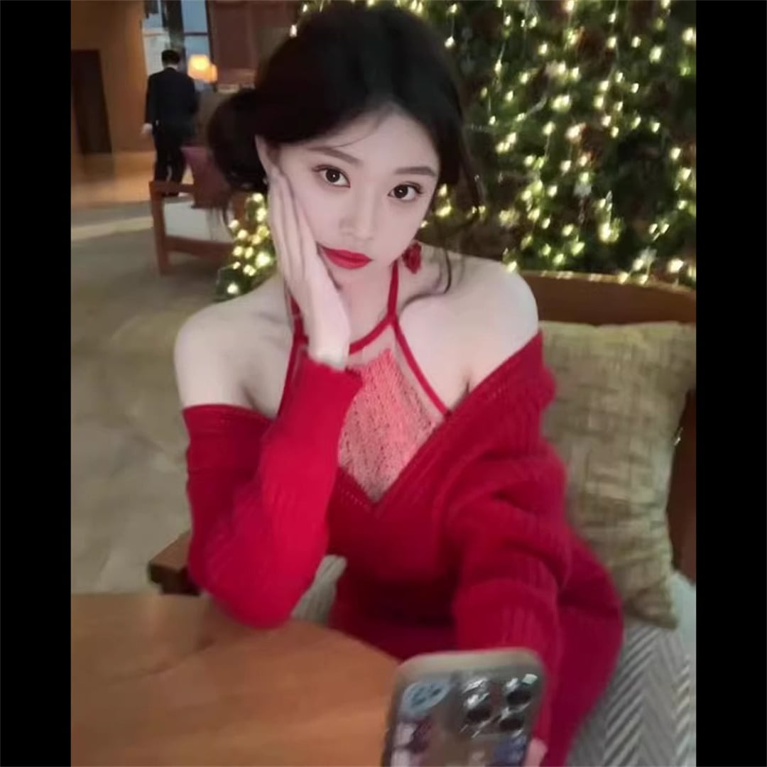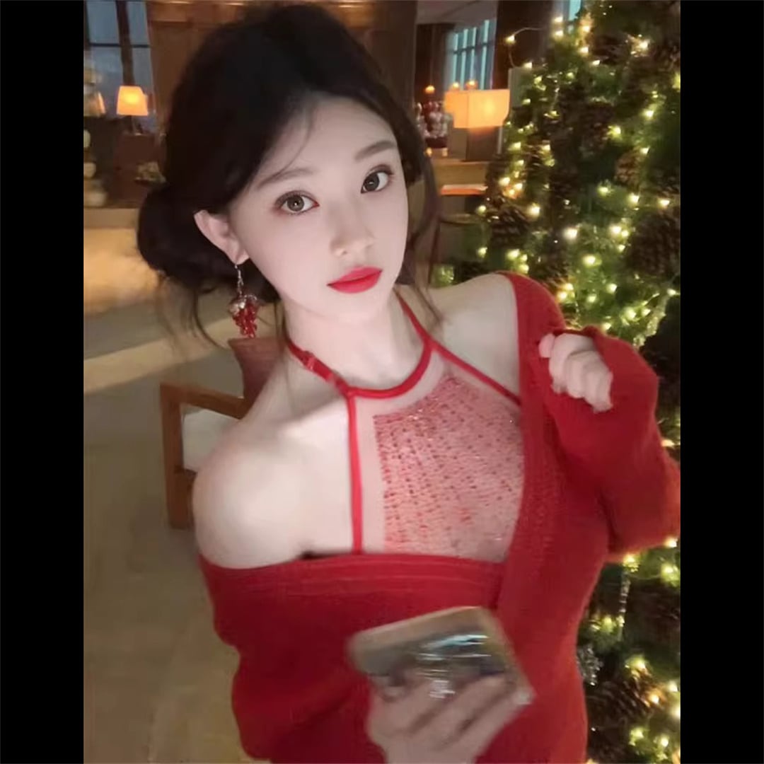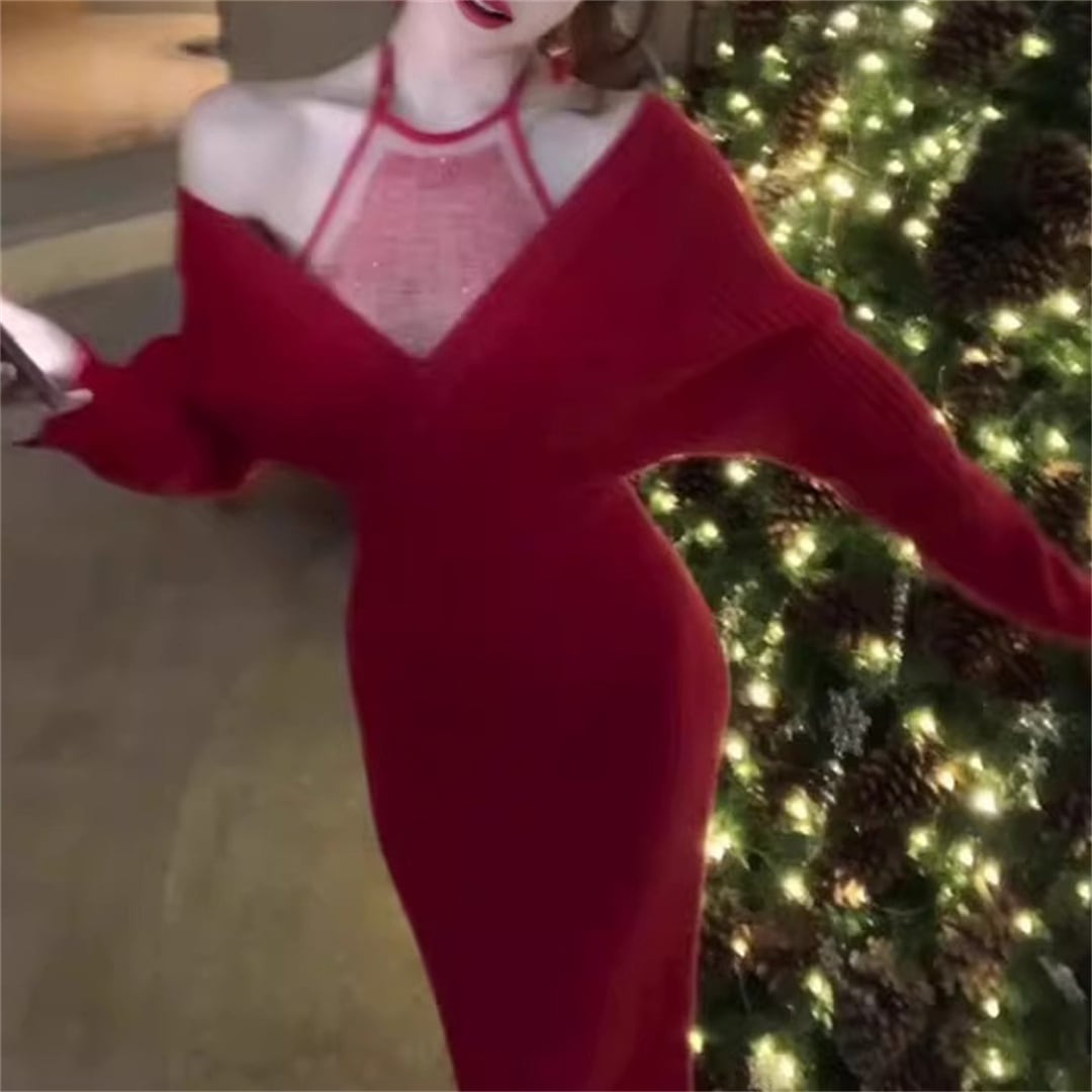 クリスマスパーティーに♪ ニット オープンショルダー スリミング効果 レッド ワンピース