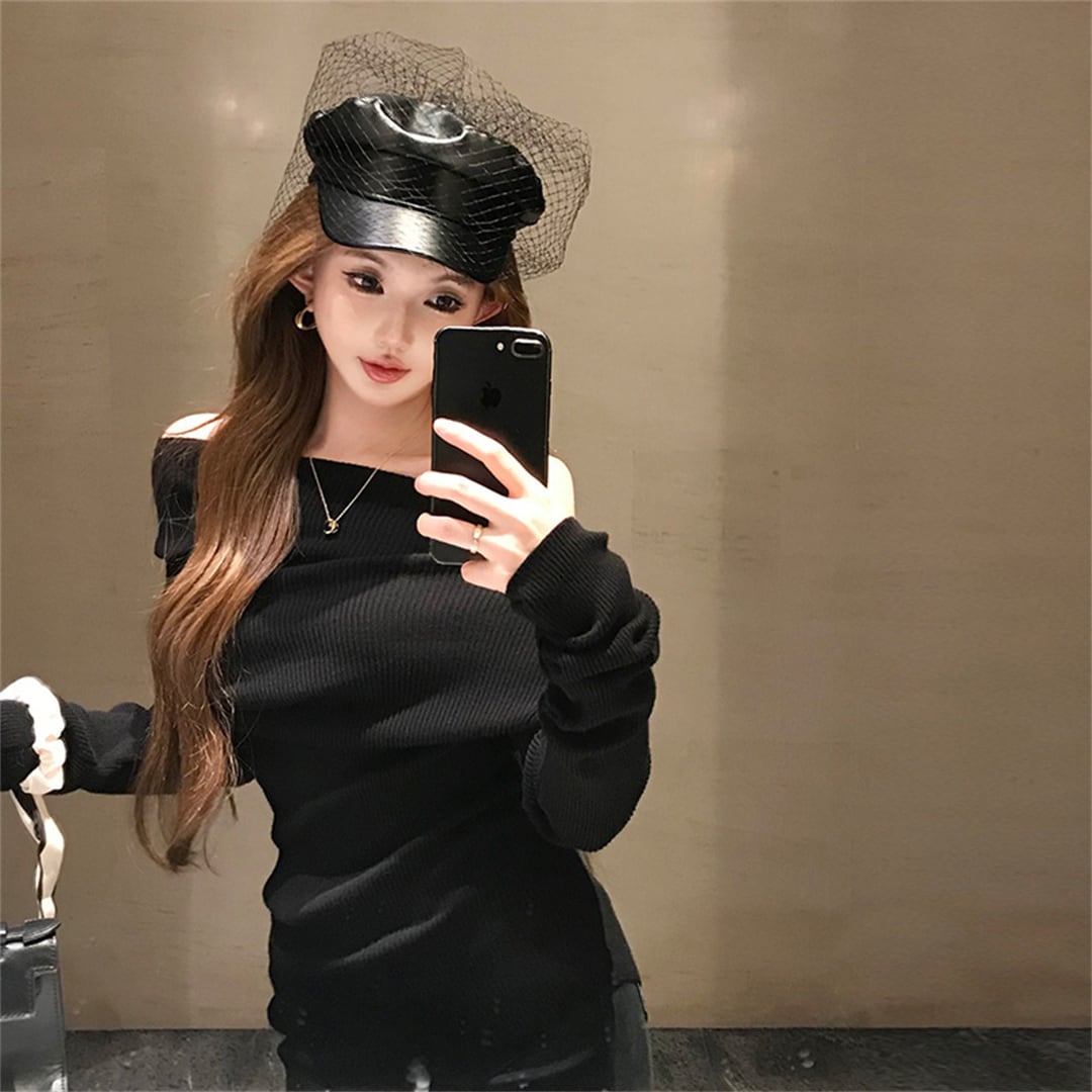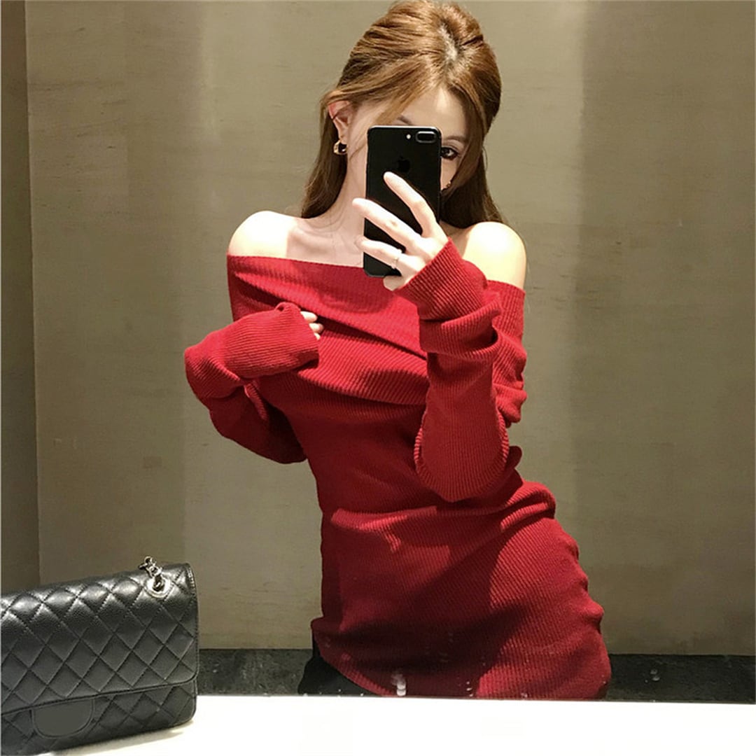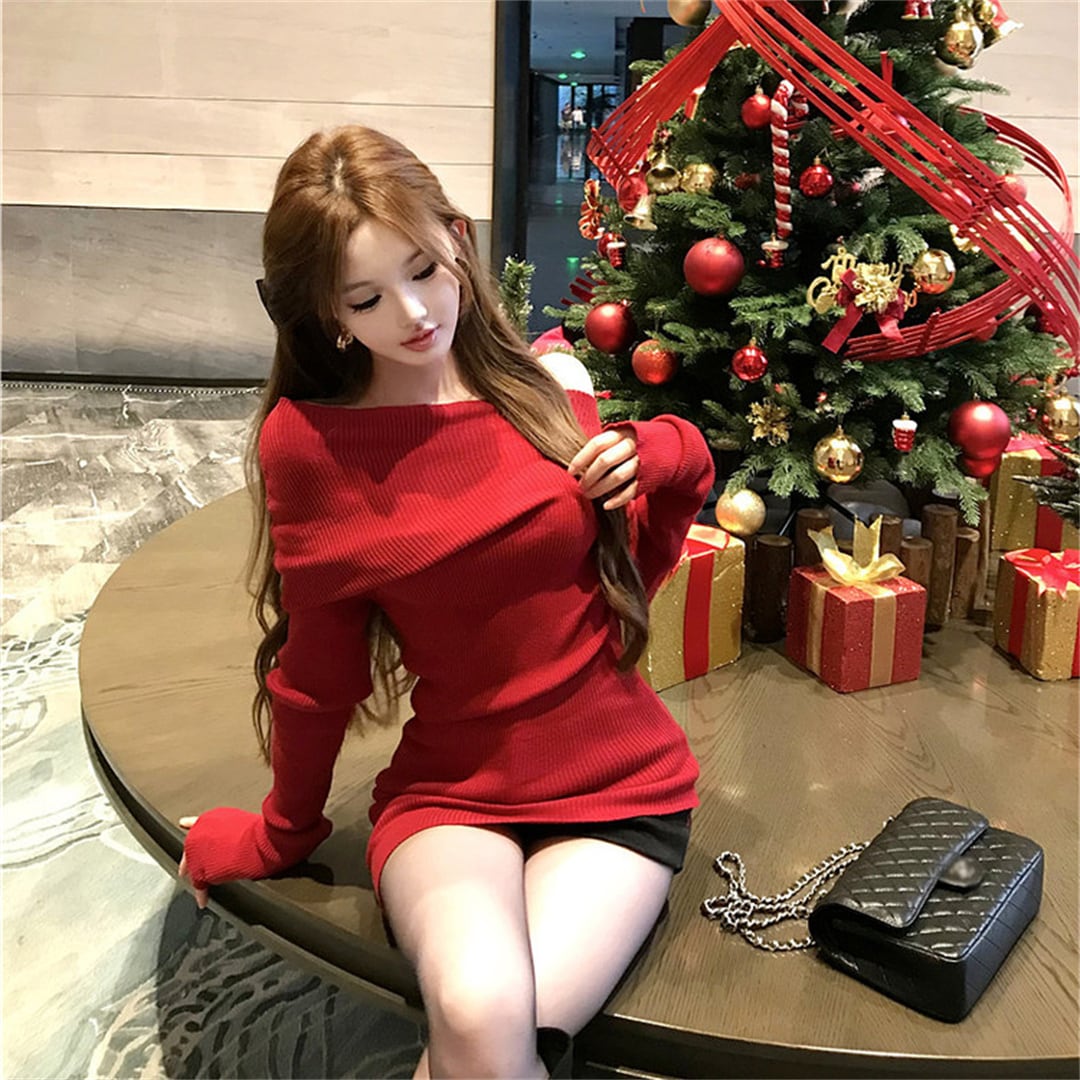 クリスマス ボディコン ニット セクシー オープンショルダー レッド ブラック ワンピース