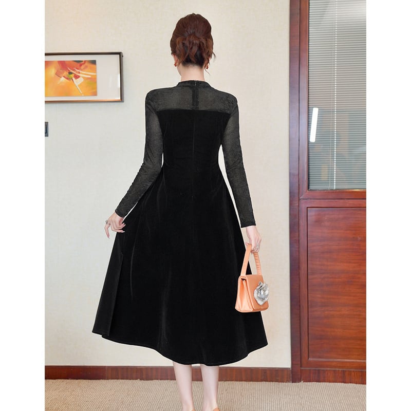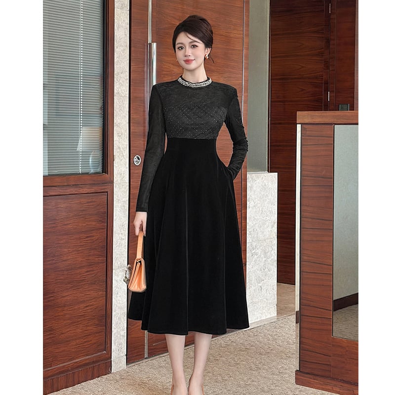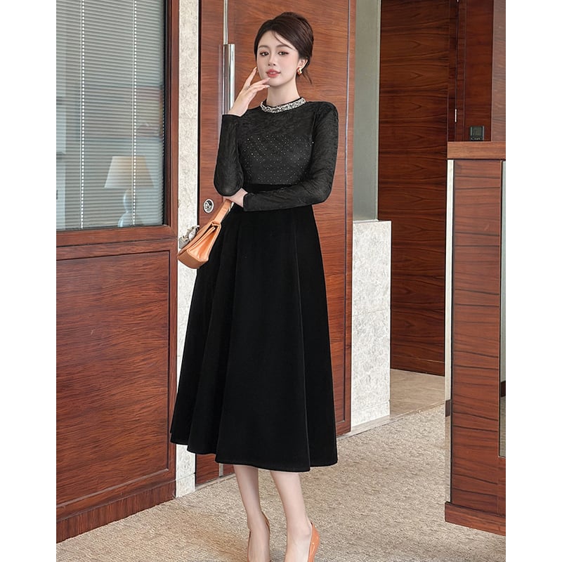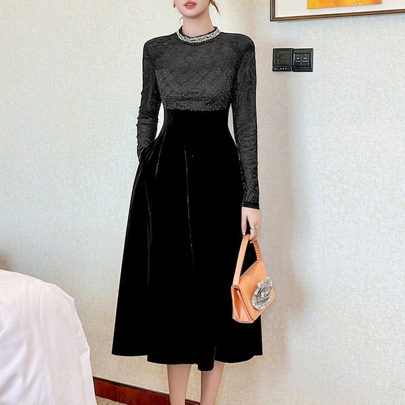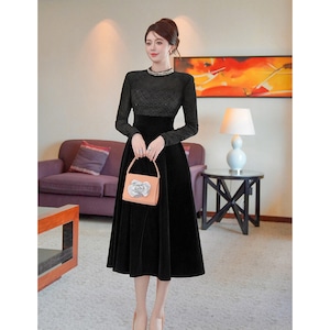【夕暮薔薇シリーズ】ワンピース ハイウエスト ラウンドネック レトロ ブラック S M L XL