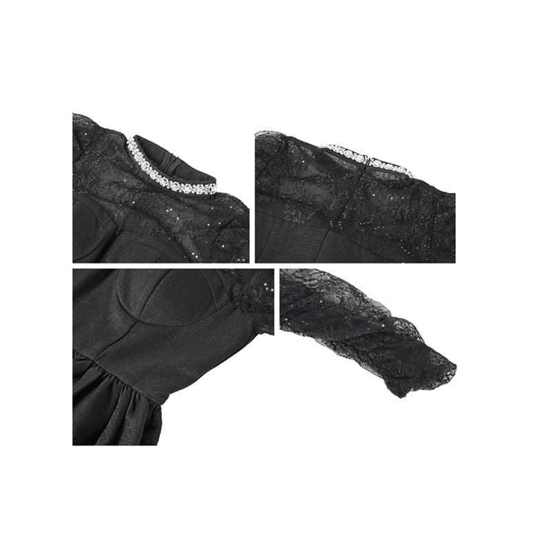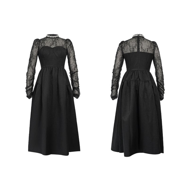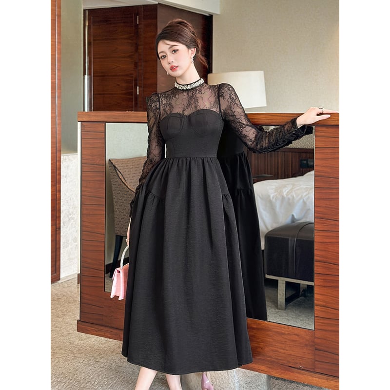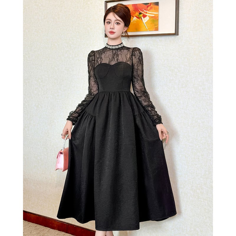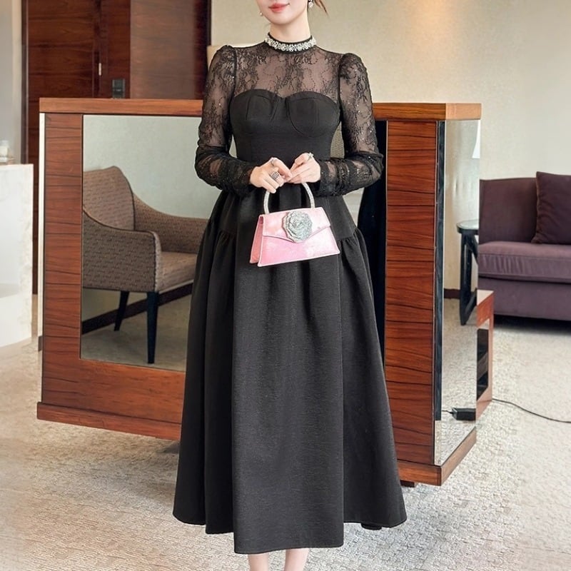 【夕暮薔薇シリーズ】ワンピース レース 長袖 ワイドスカート ブラック S M L XL